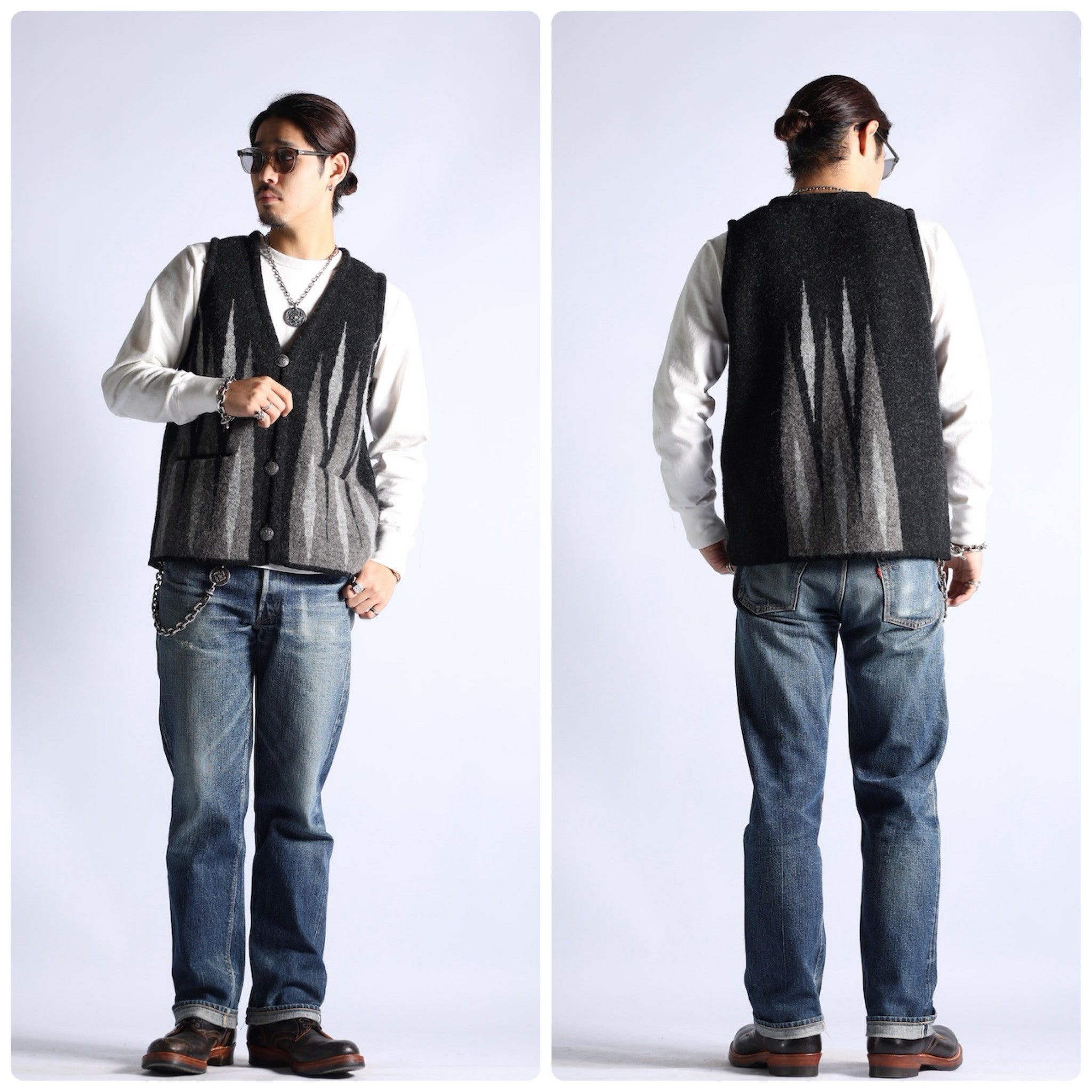 CHIMAYO VEST originated from a town called CHIMAYO in New Mexico, USA. It was named after the early Spanish colonists who were influenced by the neighboring Indians and used geometric patterns on traditional Indian clothing to make knitted clothing. , can be said to be a quite classic item, and friends who love vintage clothing, Indian culture and clothing will definitely be familiar with it.