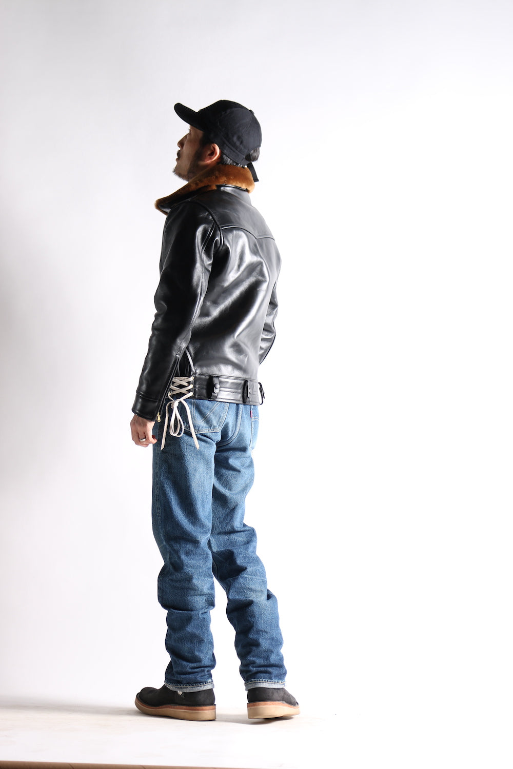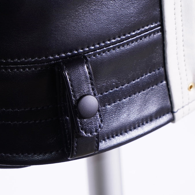 The main body is in the shape of a straight-pull lapel leather jacket, and the gorgeous details refer to the motorcycle leather jackets produced by STAR GLOVE Company for the California police in the late 1940s. There are hand pockets on the left and right sides, and the wide belt loop is a faithful replica of the configuration that could be worn to fix the holster through the police belt at that time. The flexible folds on the back and the leather straps on both sides of the waist also have a charming old-fashioned feel!