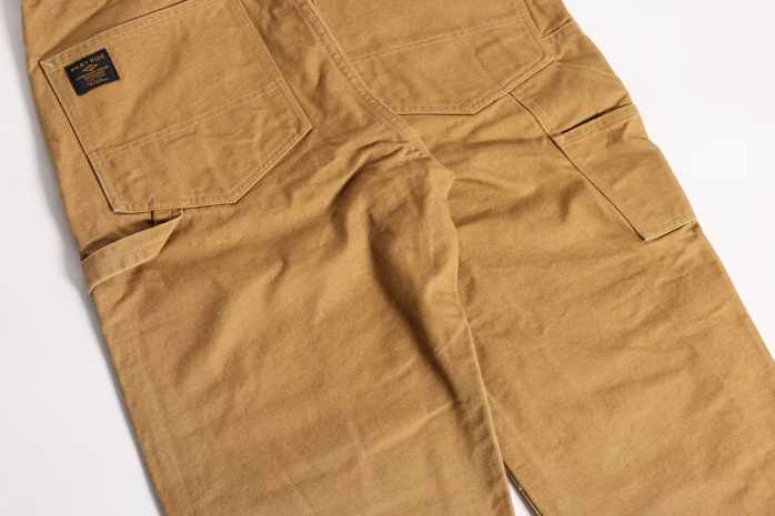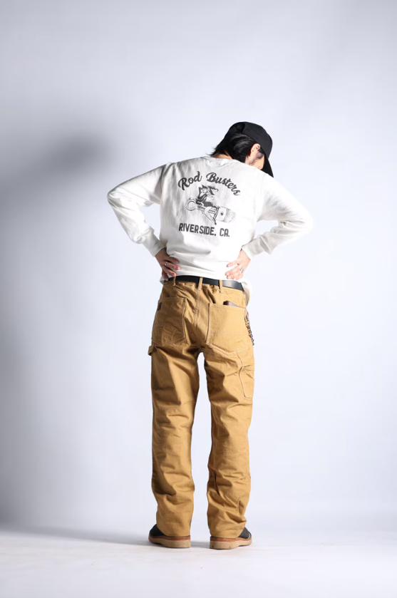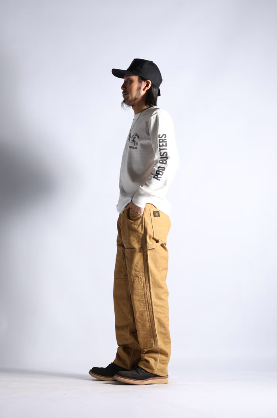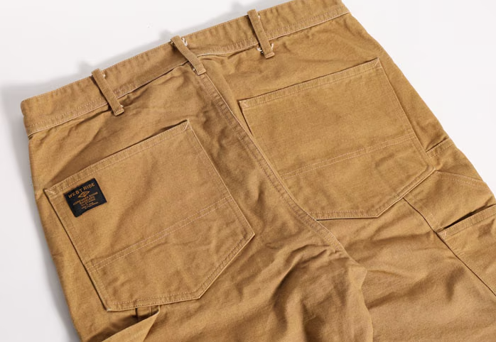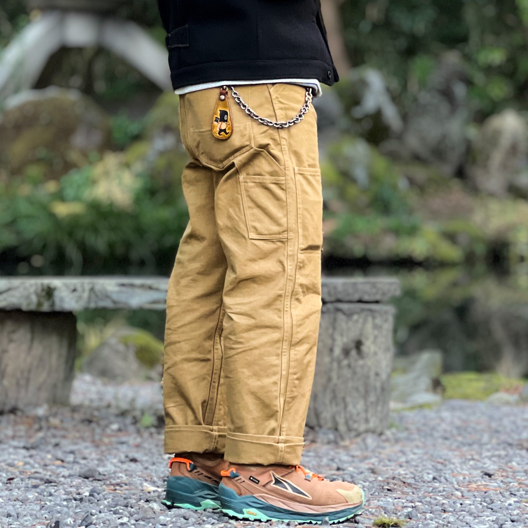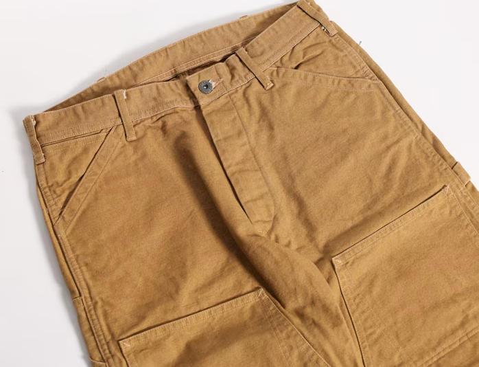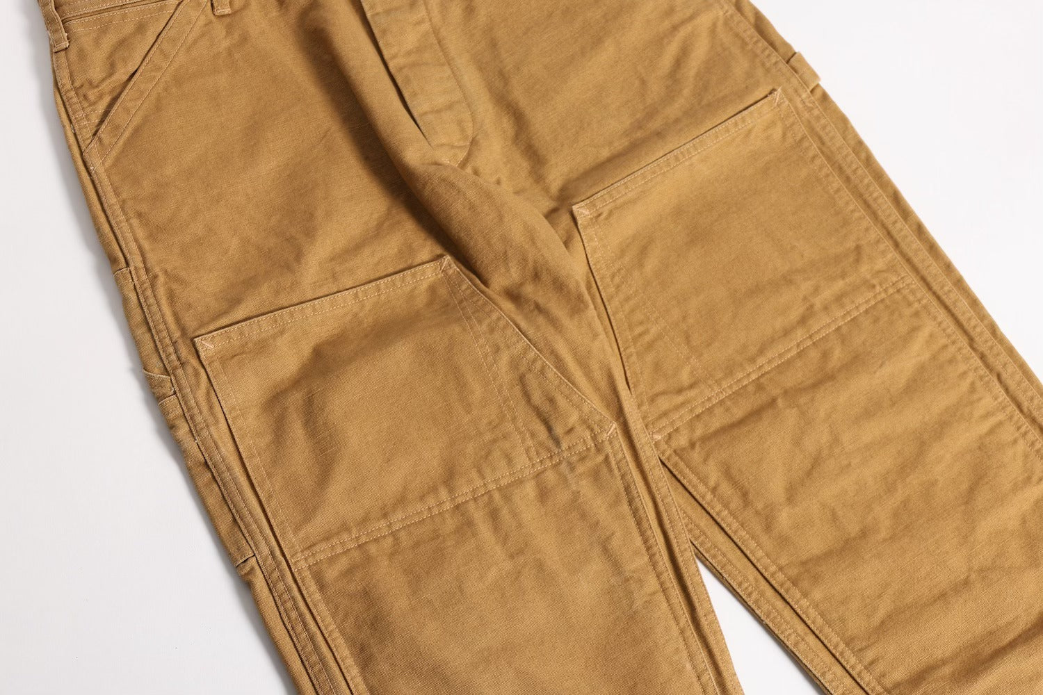 It is made of original Oxford cloth and treated with sulfur dyeing to a natural beige tone . All the main seams are made with the three stitches of work pants, which improves strength and durability! The straight wide trouser legs are paired with a large area of ​​double-layer reinforcement at the knees, and lightweight foam materials are added inside for sewing. In addition to giving the diamond-shaped stitching a slightly three-dimensional feel, it also makes the knees feel softer! And the upper part of the knee reinforcement, The front thigh pocket can be used to store mobile phones, cigarettes, etc., which is very convenient!