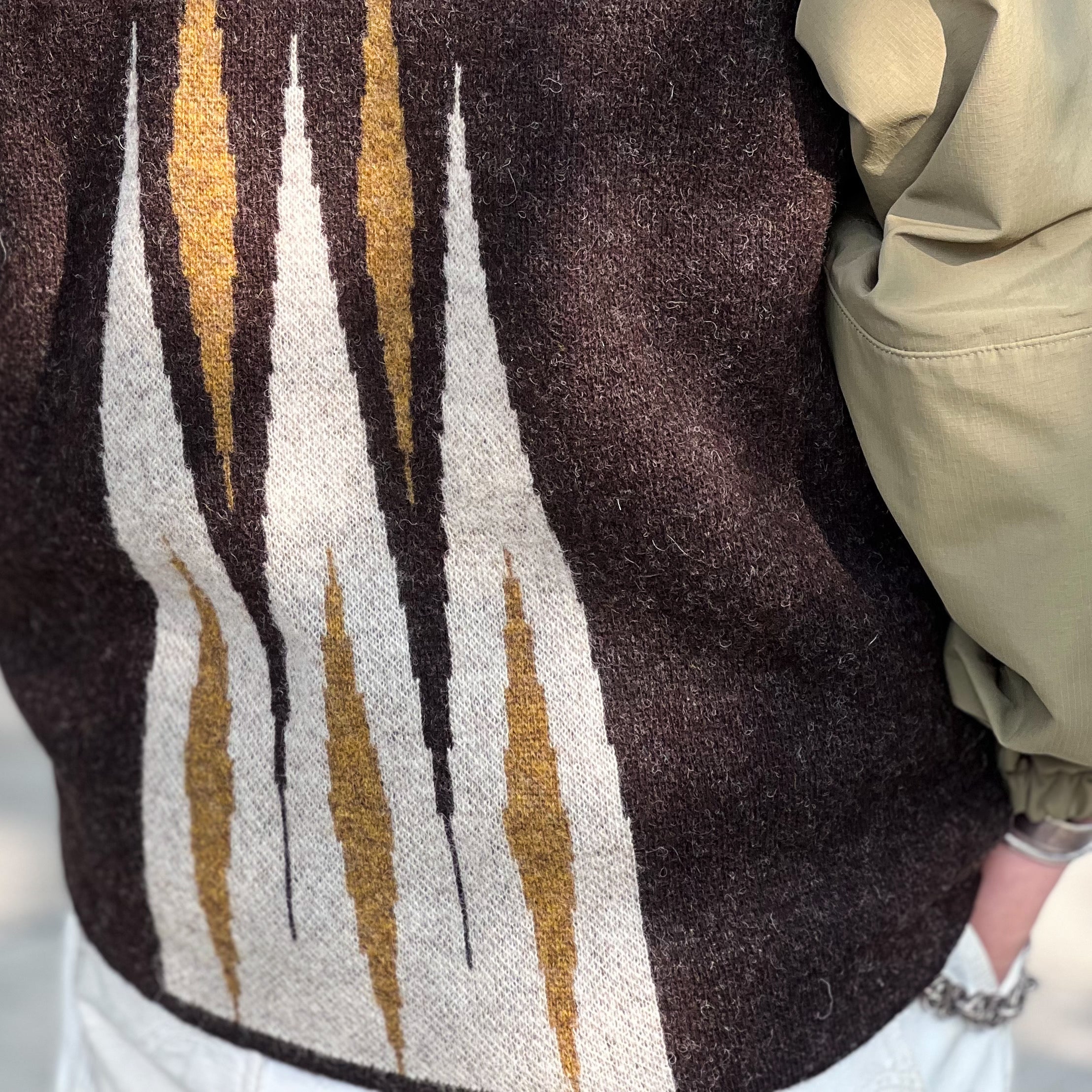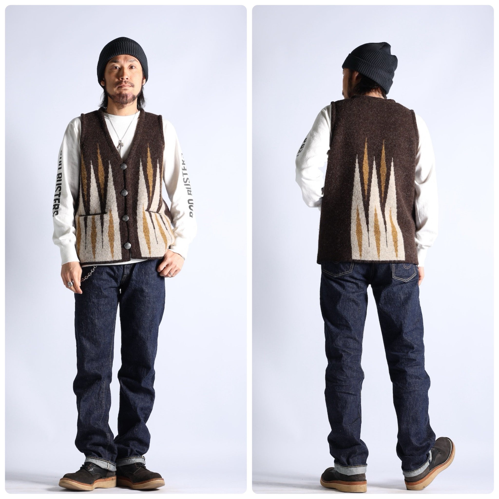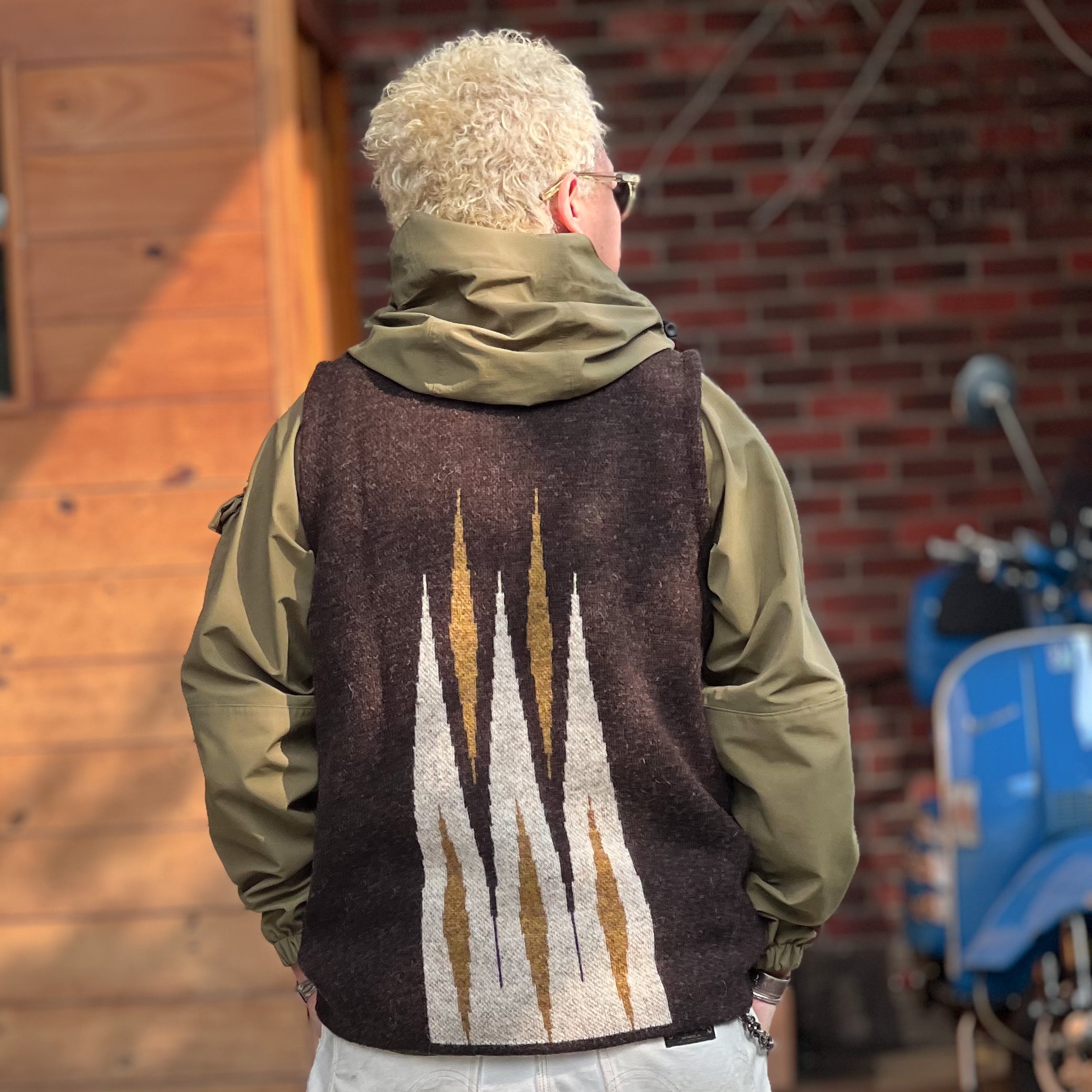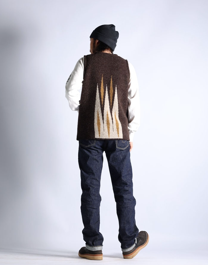 這款背心作為美式服裝的經典代表。WEST RIDE 選用奢華的雪特蘭羊毛,透過熱處理的強縮絨技術,重現古老 CHIMAYO 織布的獨特質感,並結合獨家的新潟針織技術,呈現出如同古董 VINTAGE 風格的菱形織紋,並透過 WESTRIDE 新潟自家針織技術展現出獨創的風貌。