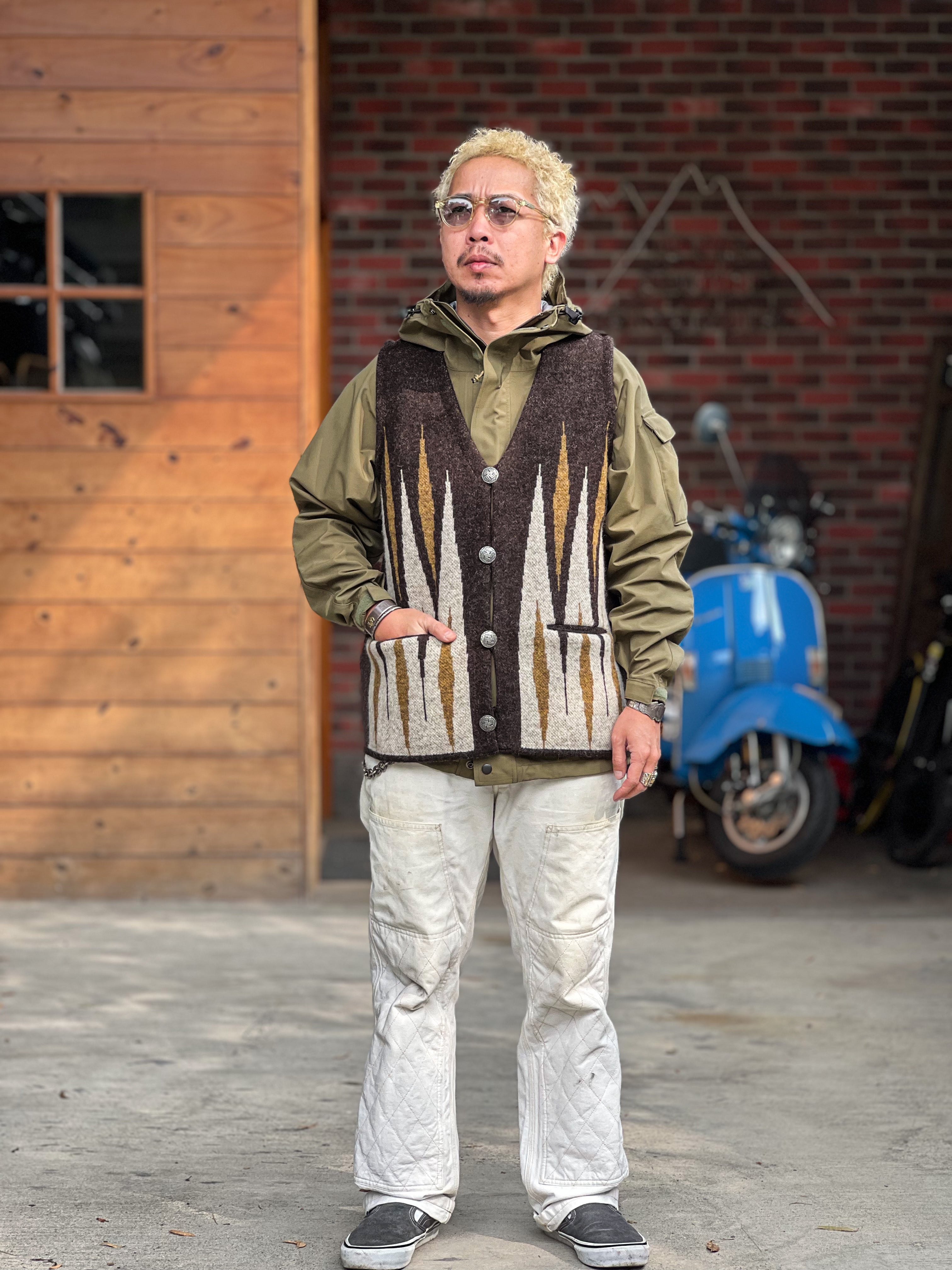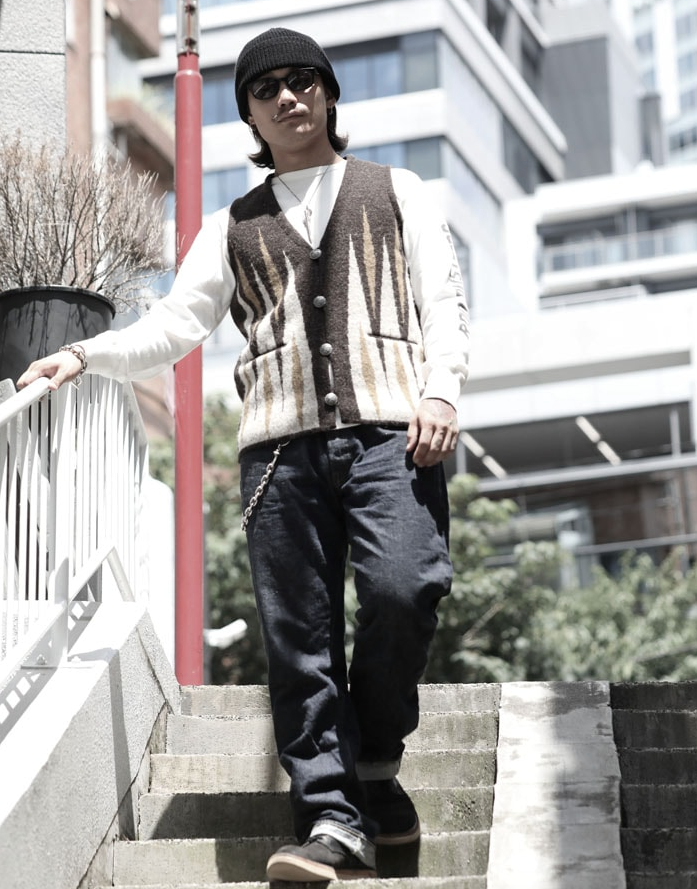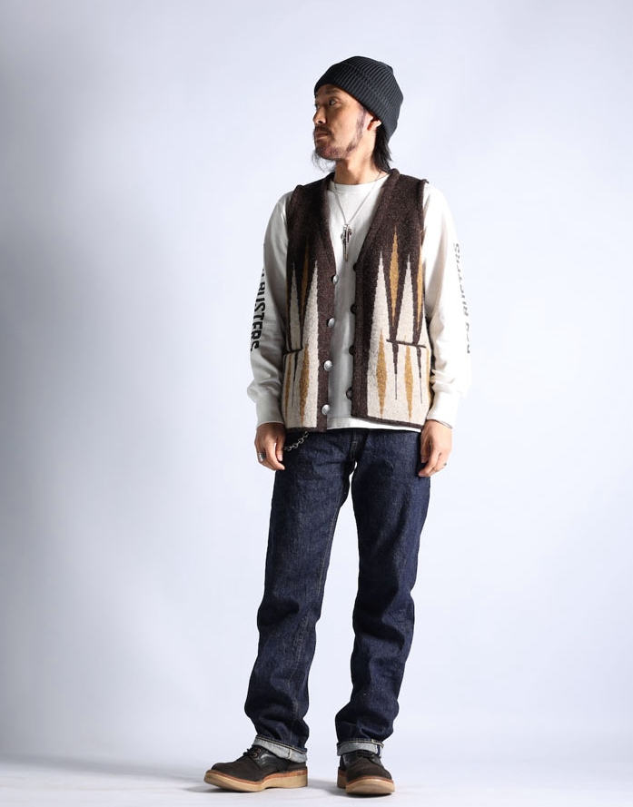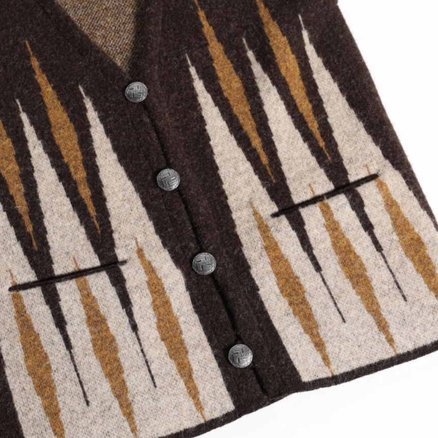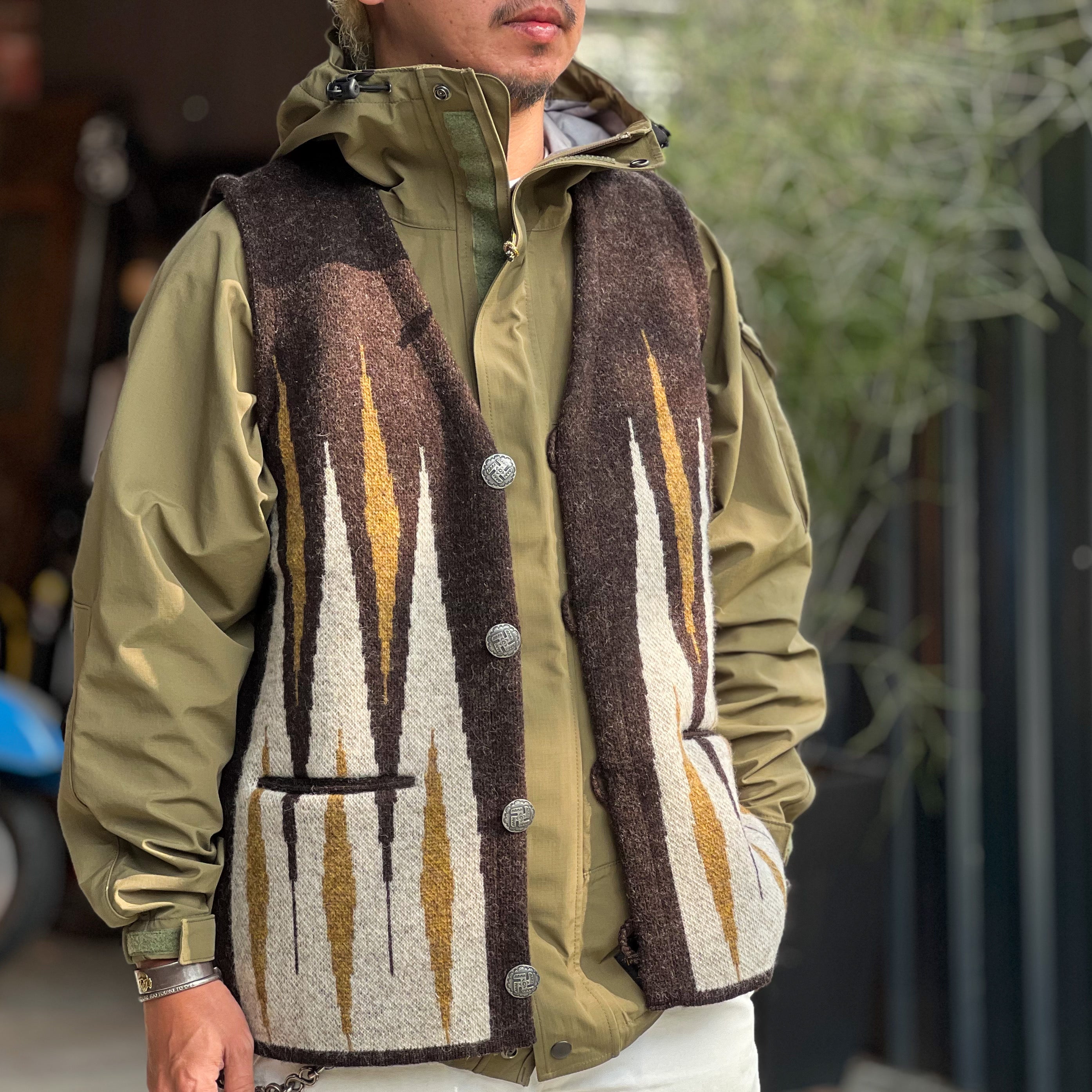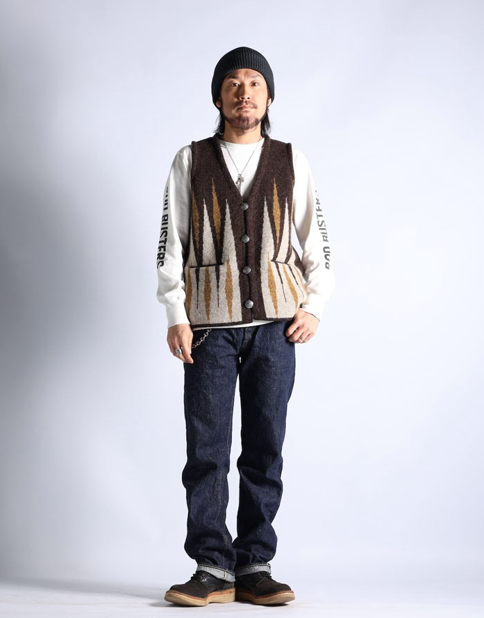 這款背心作為美式服裝的經典代表。WEST RIDE 選用奢華的雪特蘭羊毛,透過熱處理的強縮絨技術,重現古老 CHIMAYO 織布的獨特質感,並結合獨家的新潟針織技術,呈現出如同古董 VINTAGE 風格的菱形織紋,並透過 WESTRIDE 新潟自家針織技術展現出獨創的風貌。