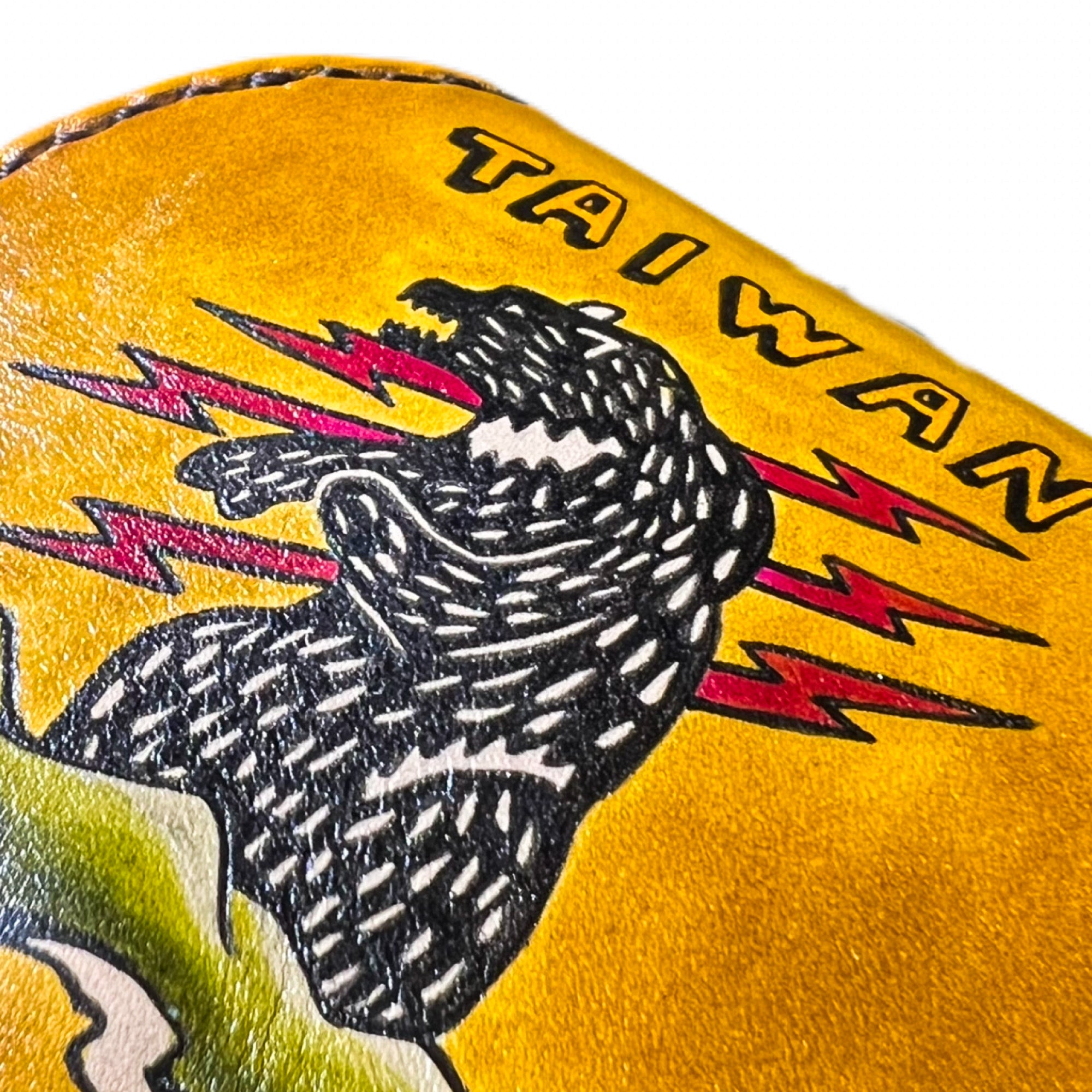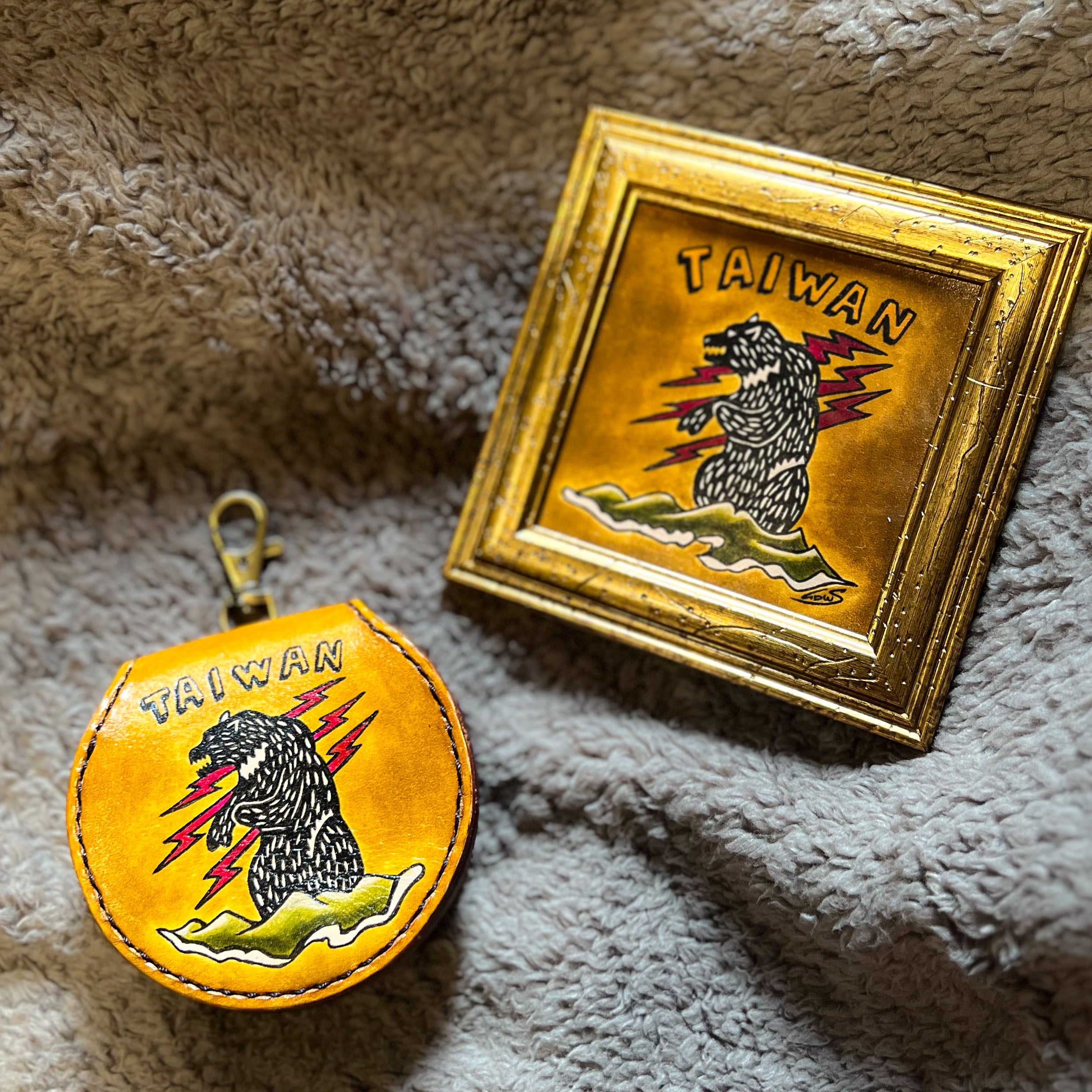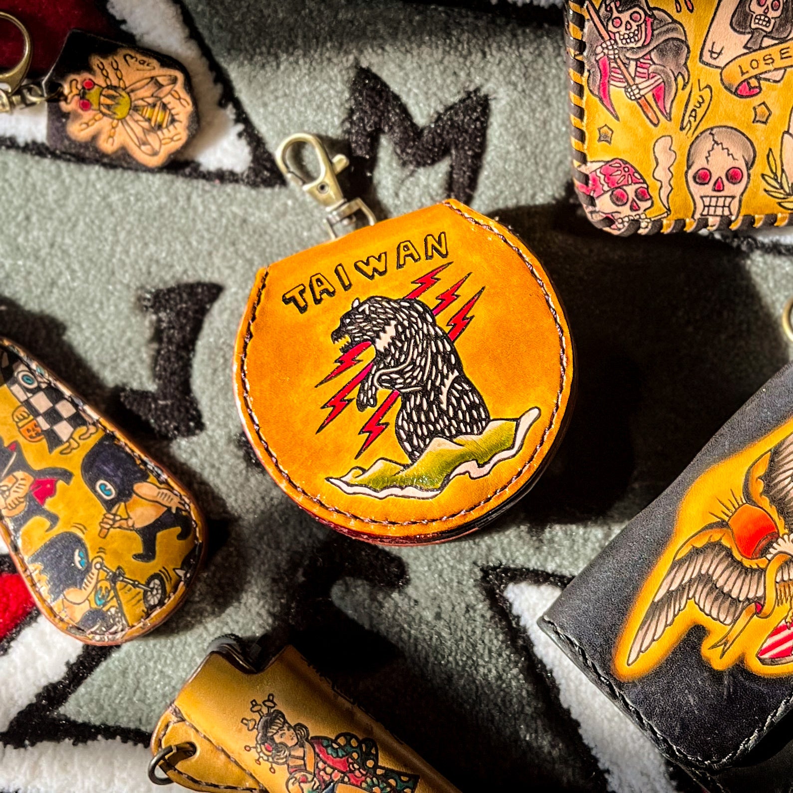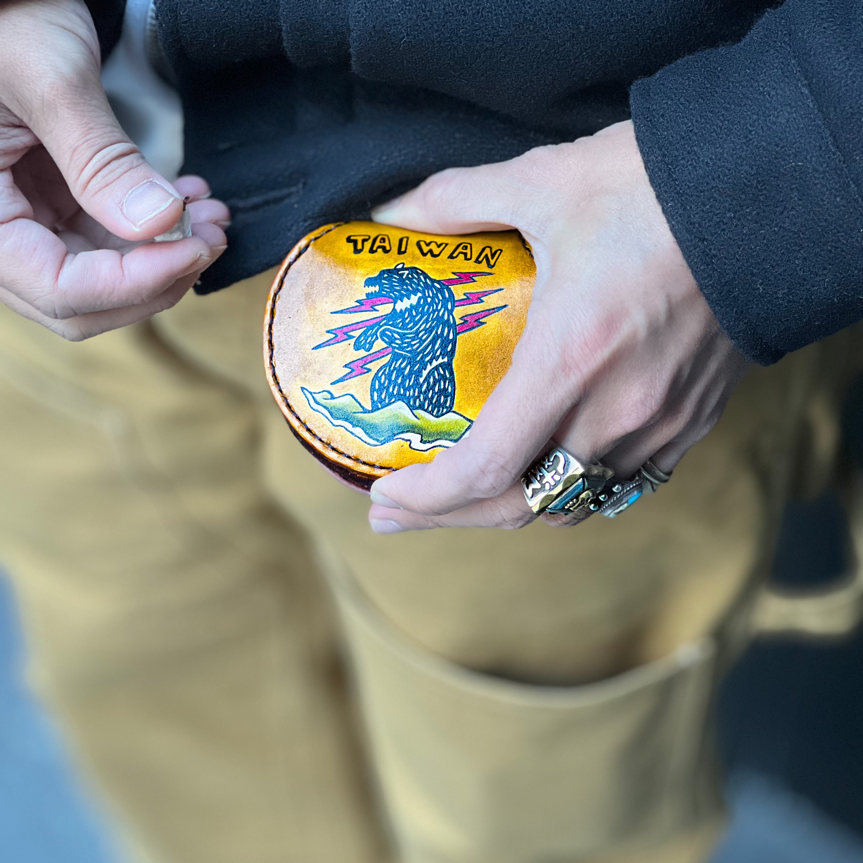 單品全程由 Wee 桑一人製作,包含皮革染色、縫製、設計圖的繪製上色等等,正面是黑熊與 TAIWAN 字樣,背面則是左右對稱的閃電和 MAY CLUB 字樣,因為一個一個手作,即使是相同的設計,在細節上也都有差異,每一件作品都是獨一無二的藝術品。開口以壓釦固定,吊掛的五金扣件將更換為另一款更大的銅勾(詳見照片說明),可更便利的勾掛於較寬的褲耳或背包上。