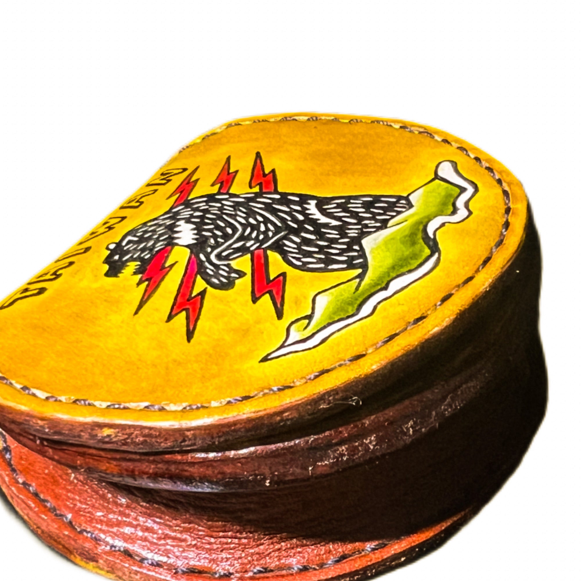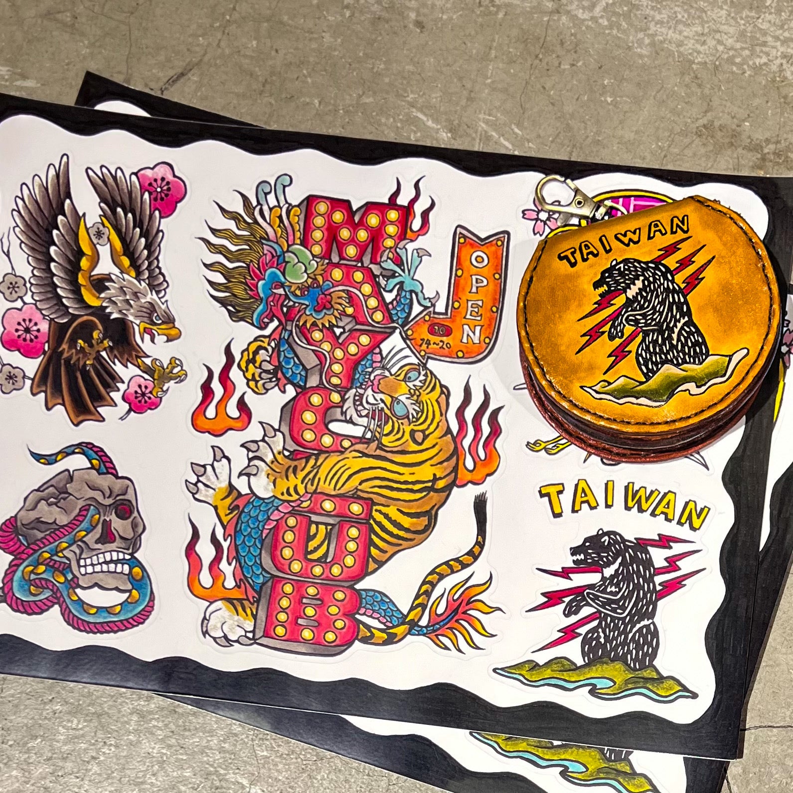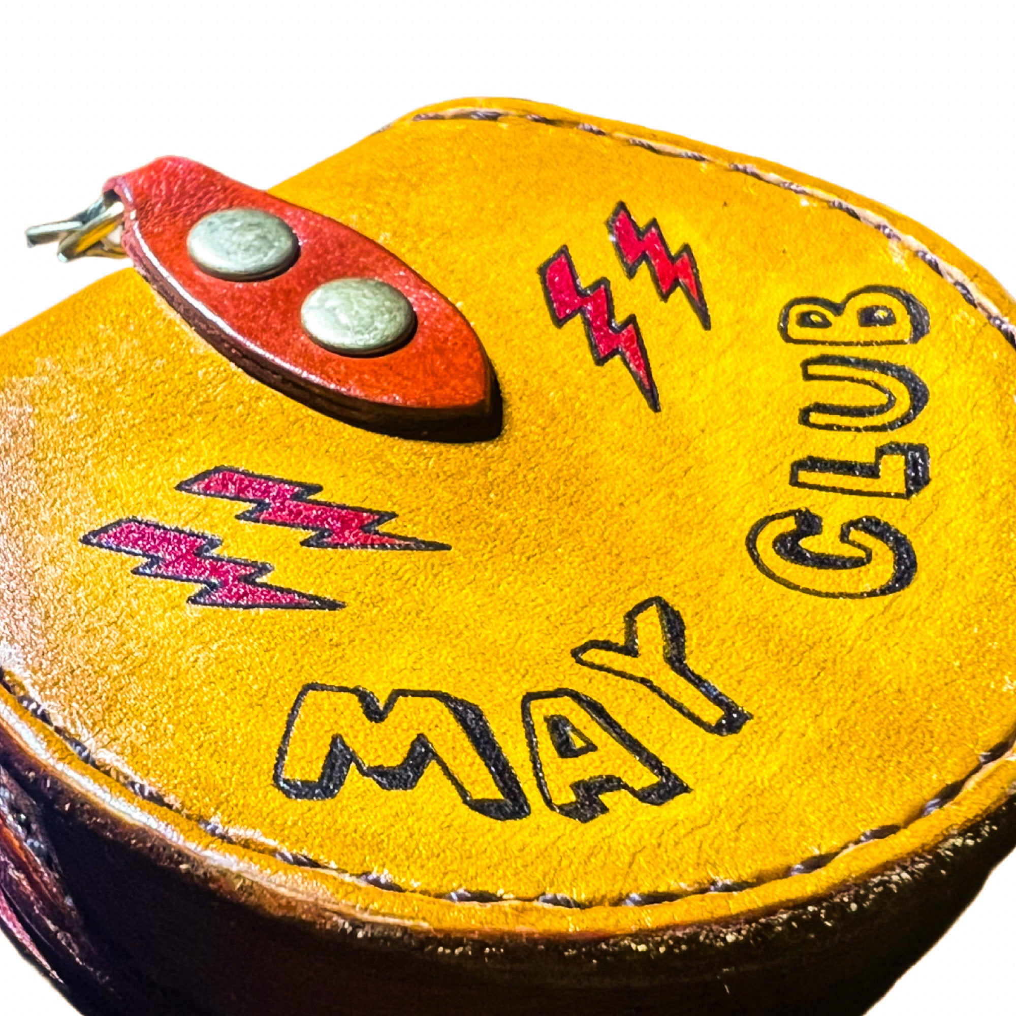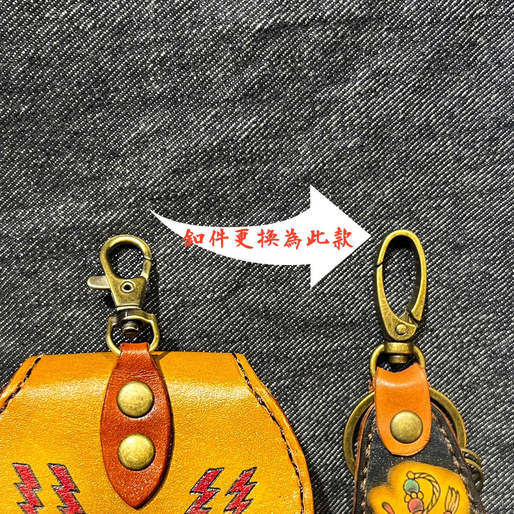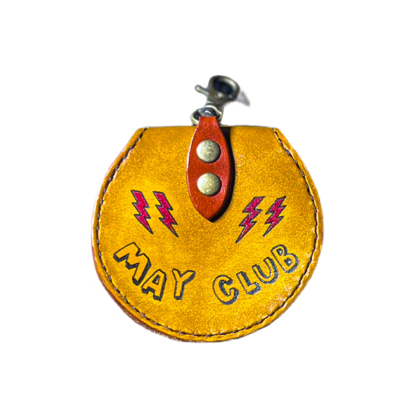 單品全程由 Wee 桑一人製作,包含皮革染色、縫製、設計圖的繪製上色等等,正面是黑熊與 TAIWAN 字樣,背面則是左右對稱的閃電和 MAY CLUB 字樣,因為一個一個手作,即使是相同的設計,在細節上也都有差異,每一件作品都是獨一無二的藝術品。開口以壓釦固定,吊掛的五金扣件將更換為另一款更大的銅勾(詳見照片說明),可更便利的勾掛於較寬的褲耳或背包上。