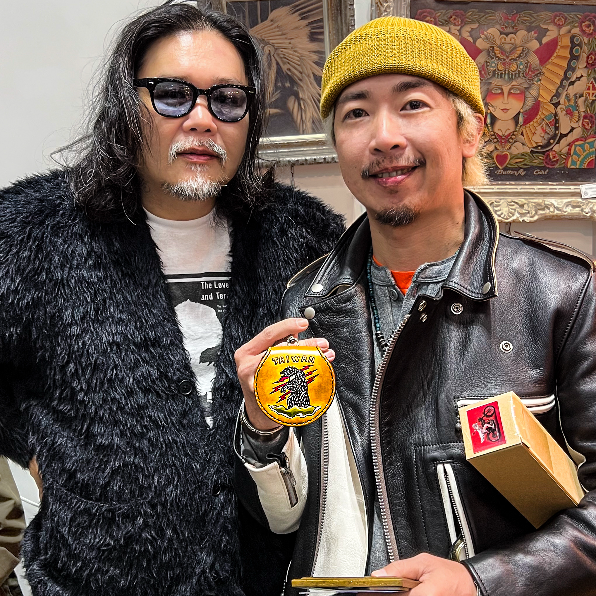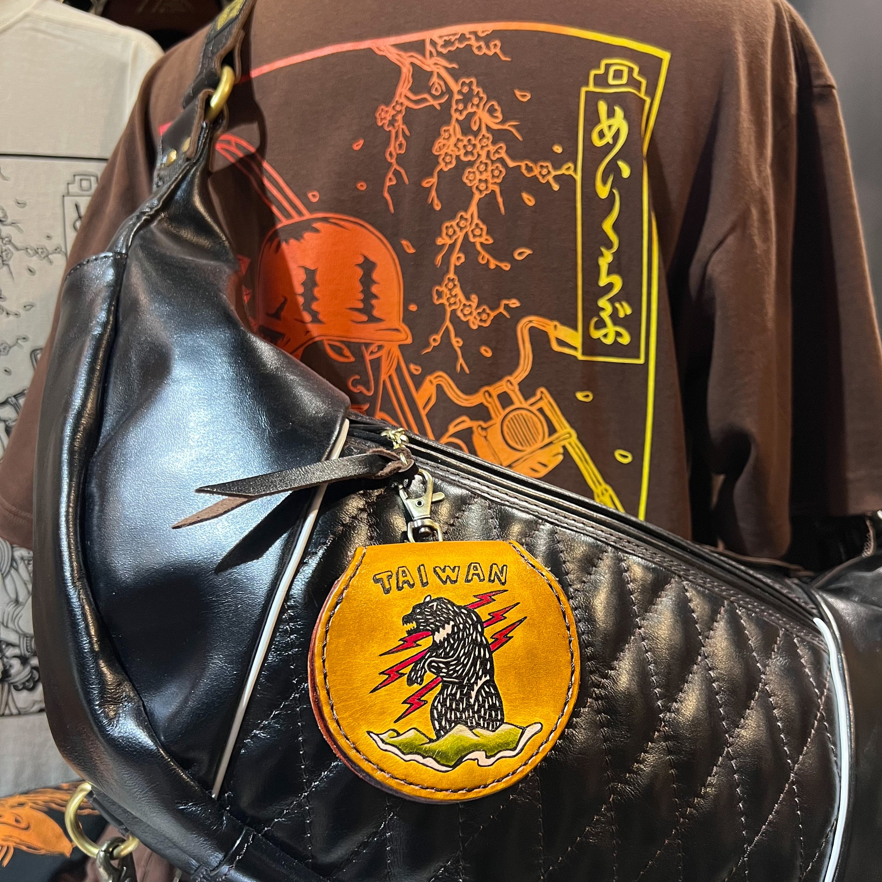 而這個有趣的圖樣既有著古著的靈魂,又具有台灣元素,一下就擊中美老闆的心,當時也特別和 Wee 桑討論決定了這款隨身小包的雛形,在橫濱 HRCS 活動拿到後美老闆愛不釋手,幾乎每日都配戴!