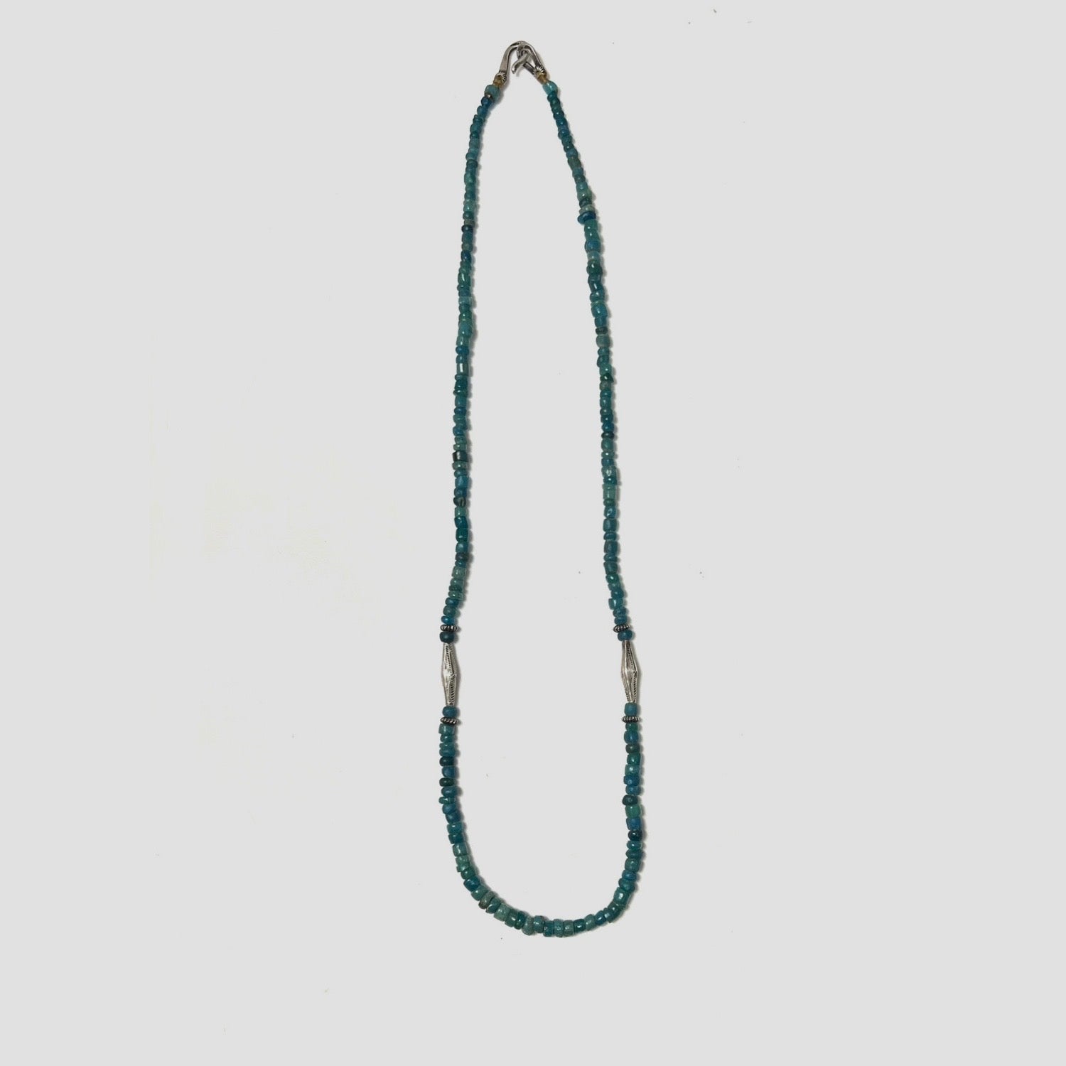在古董市場日益稀缺的貿易珠中,以受到時光雕琢的印度太平洋琉璃珠,結合 Coin Silver 的銀管珠作為點睛之筆,打造出這件極具特色的逸品。
