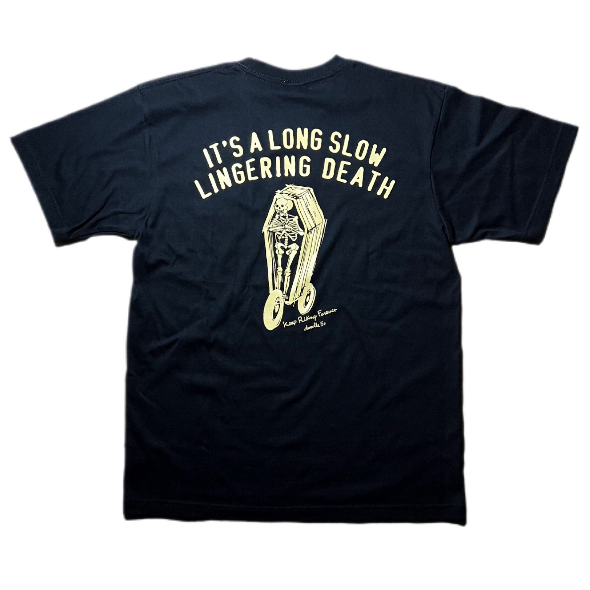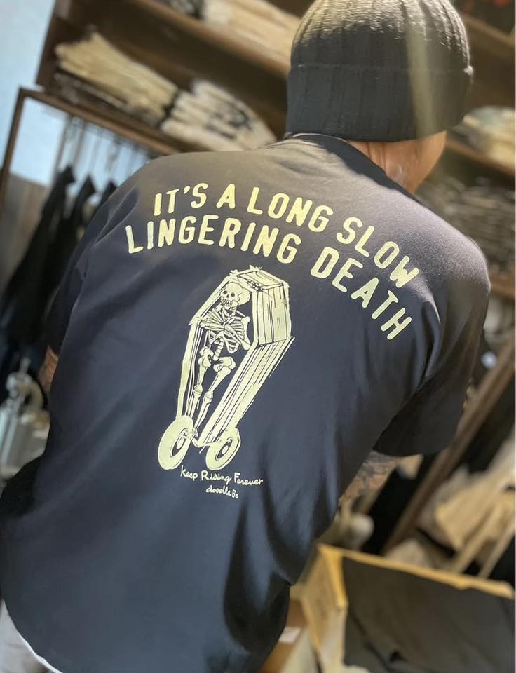 背後的主圖以骷髏在結合二輪的直立棺材中,主標題為 It’s a long slow lingering death,雖然直譯是指生命就是一場漫長的死亡過程,但隱含的意思卻是感嘆人生本來就是一場有終點的旅程,所以更該照著自己的方式活,也是向大家喊話要享受騎車直到最後。