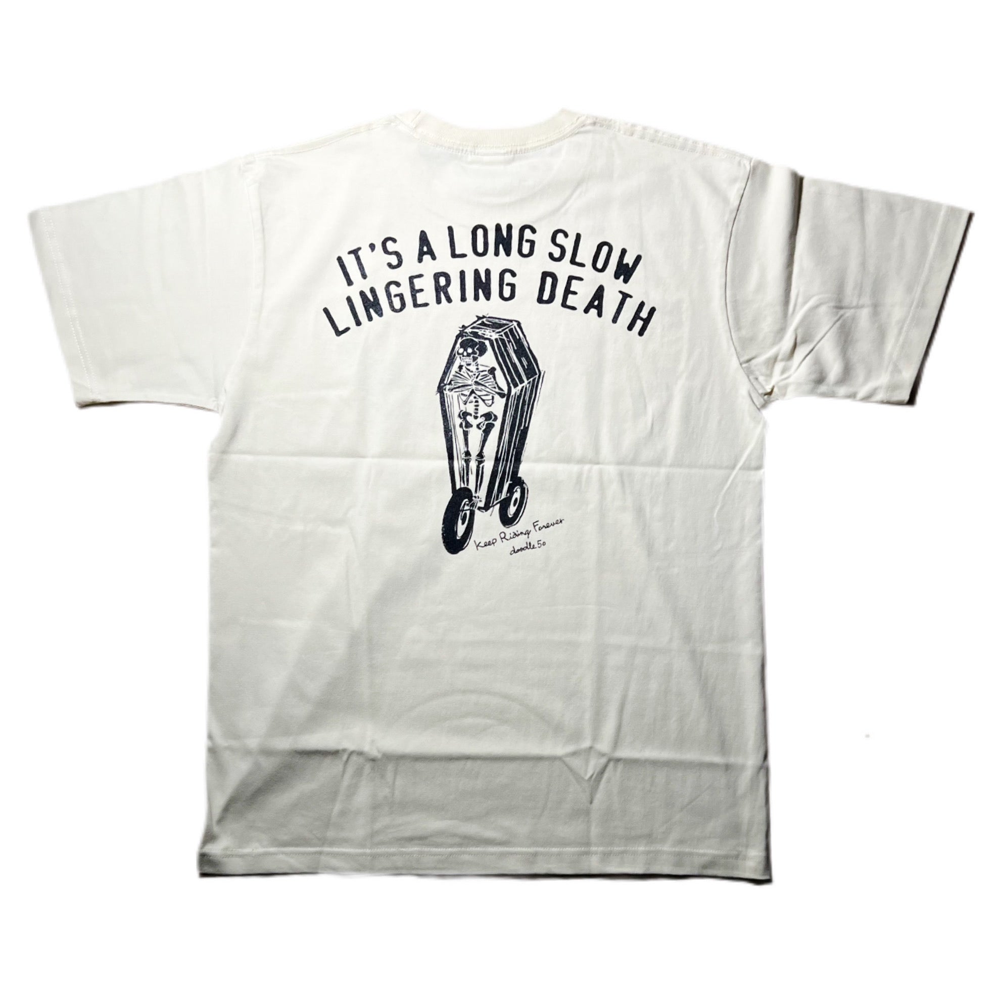 背後的主圖以骷髏在結合二輪的直立棺材中,主標題為 It’s a long slow lingering death,雖然直譯是指生命就是一場漫長的死亡過程,但隱含的意思卻是感嘆人生本來就是一場有終點的旅程,所以更該照著自己的方式活,也是向大家喊話要享受騎車直到最後。