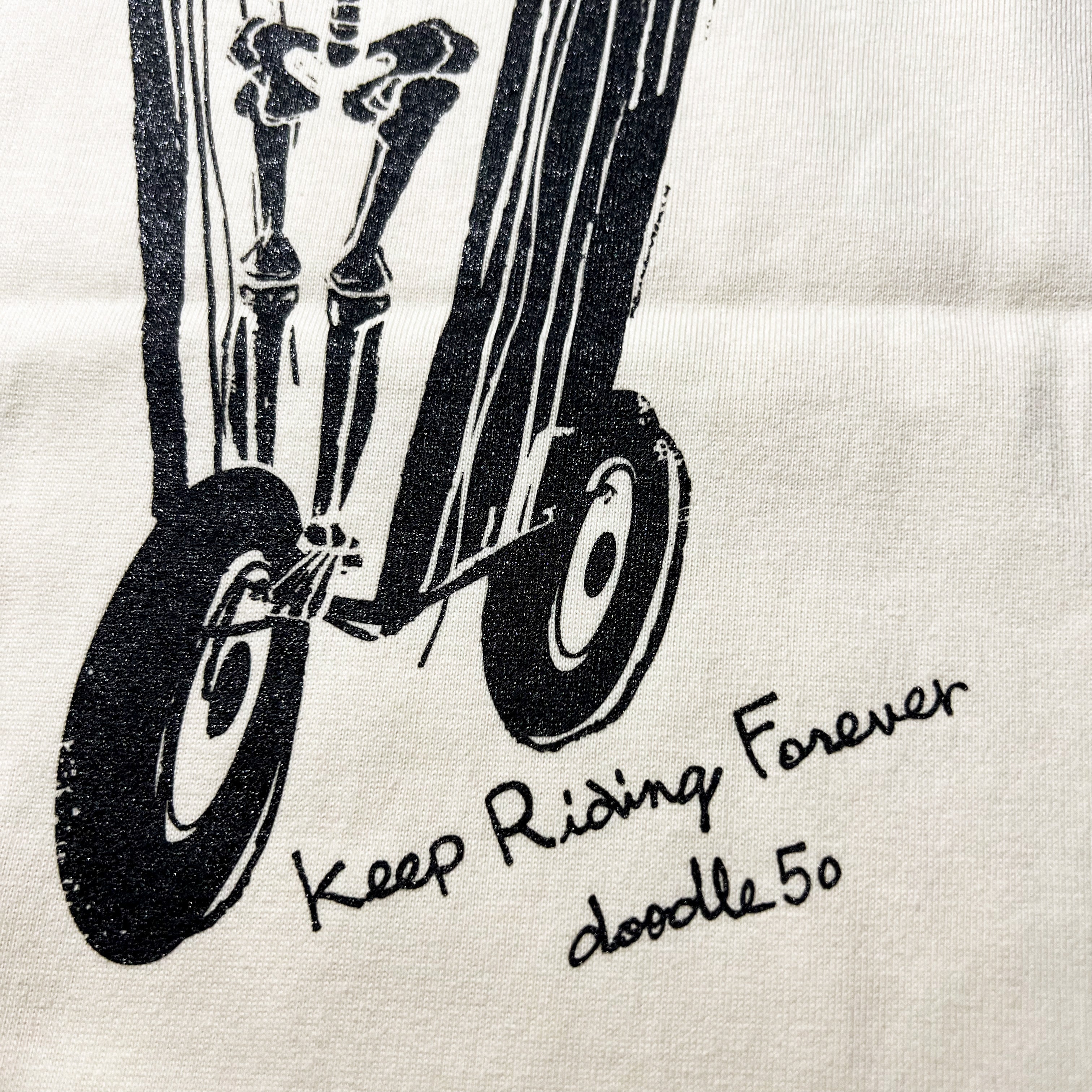 左胸口的骷髏小圖搭配 KRF 字樣,象徵著 Keep Riding Forever。