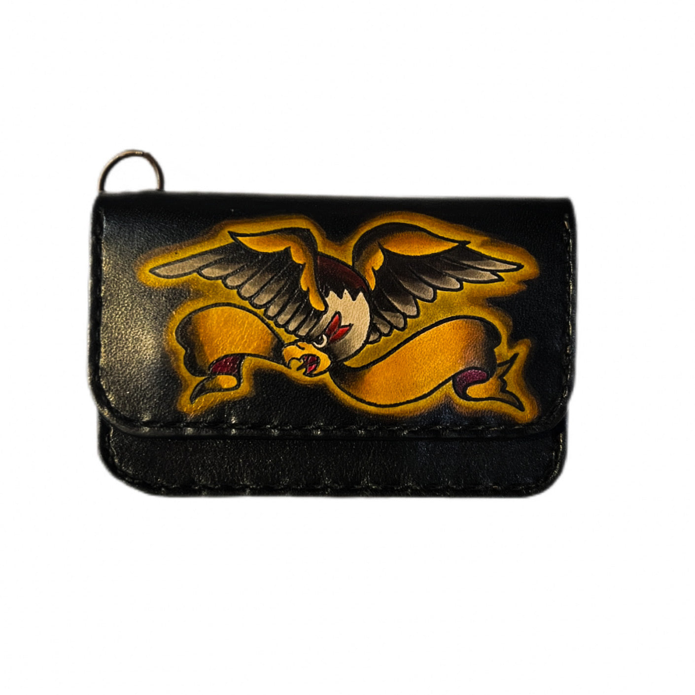 由皮革藝術家 Weed 氏以復古的筆觸描繪創作美式傳統刺青老鷹的圖像,清晰的輪廓與鮮明的色調帶有強烈的 Old School 氛圍,將其他範圍染黑色也突出鮮明的主題。