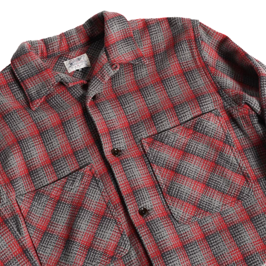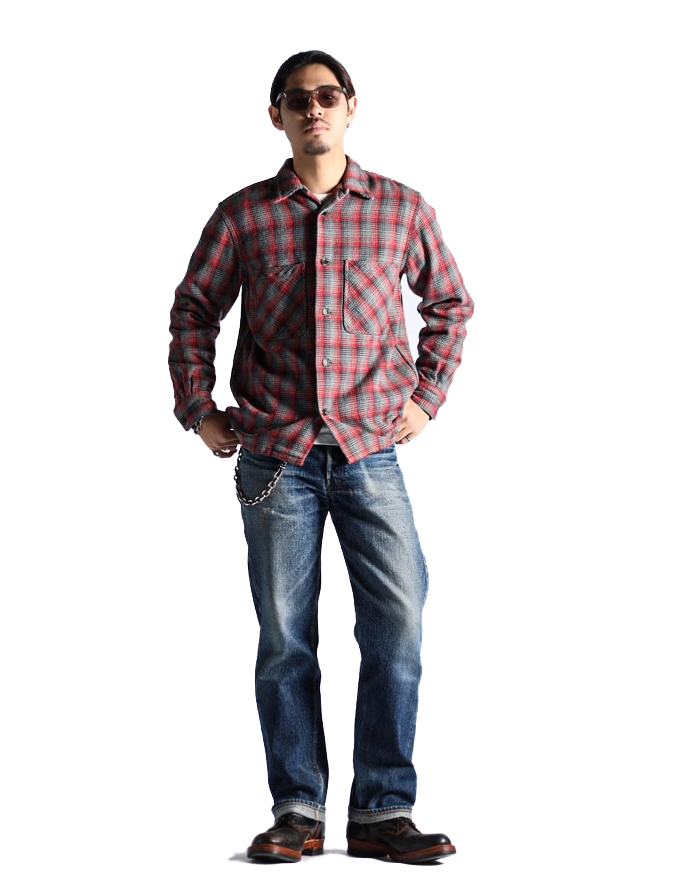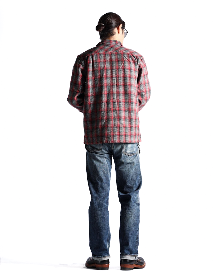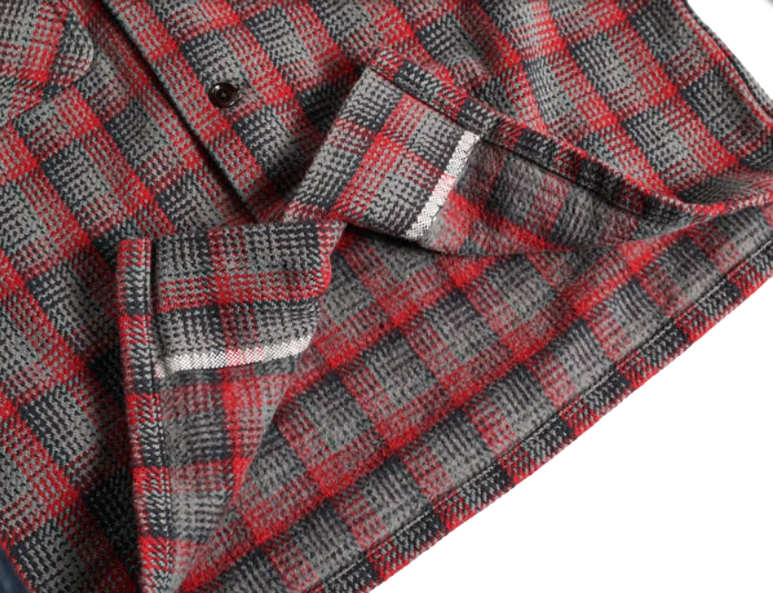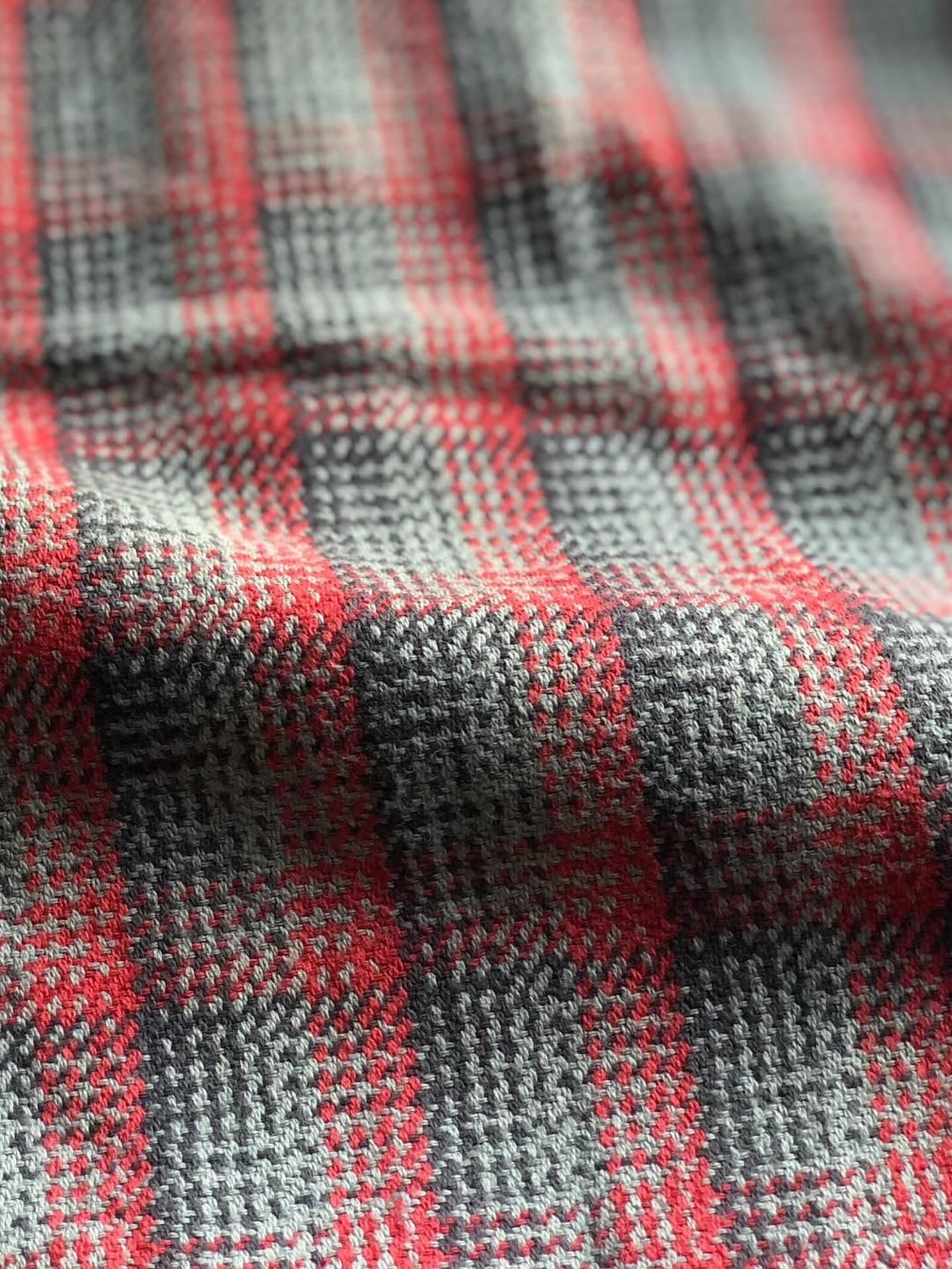 100% 純棉材質,經紗採用 10 號雙股紗、緯紗為 8 號單紗,運用至新潟力織機可使用的極限紗線規格所構成。厚實的布料質地,表面輕微起毛、內側深刷毛,形成柔軟細膩的觸感,是 WESTRIDE 原創的重磅斜紋格紋面料。