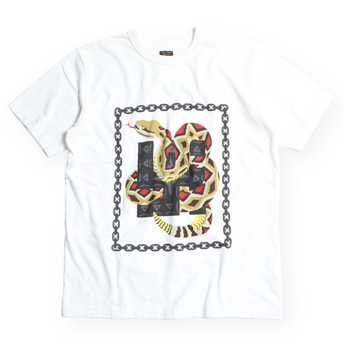 以實際存在的 vintage 龍圖樣融入 West Ride 獨特的世界觀,將響尾蛇與卍字交融,並被鏈條所包圍。圖中的卍字是由 4 個 L 所組成(LOVE / LUCK / LIFE / LIGHT),也是因為此設計而有了 West Ride 與 Larry Smith 的卍字銀鍊系列單品。由於色塊相當豐富,共使用七個版印刷,更為費時。