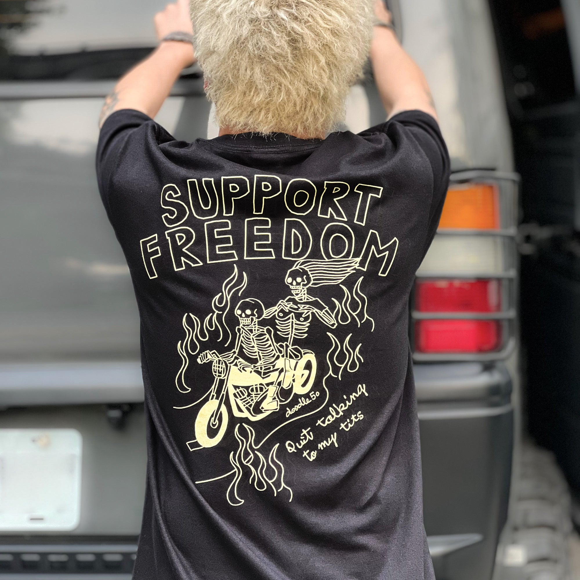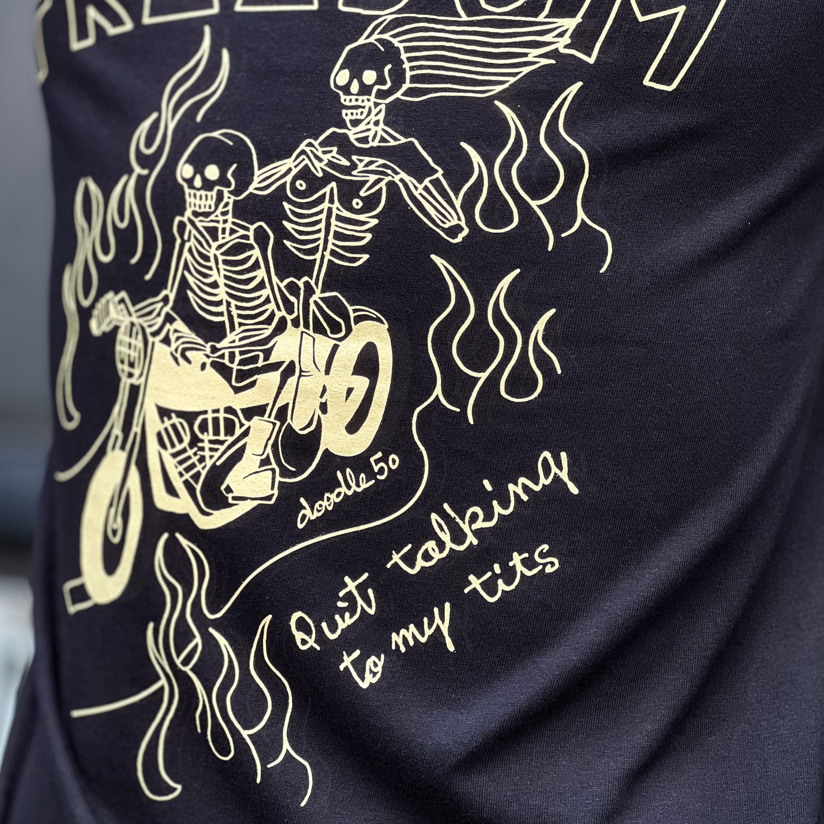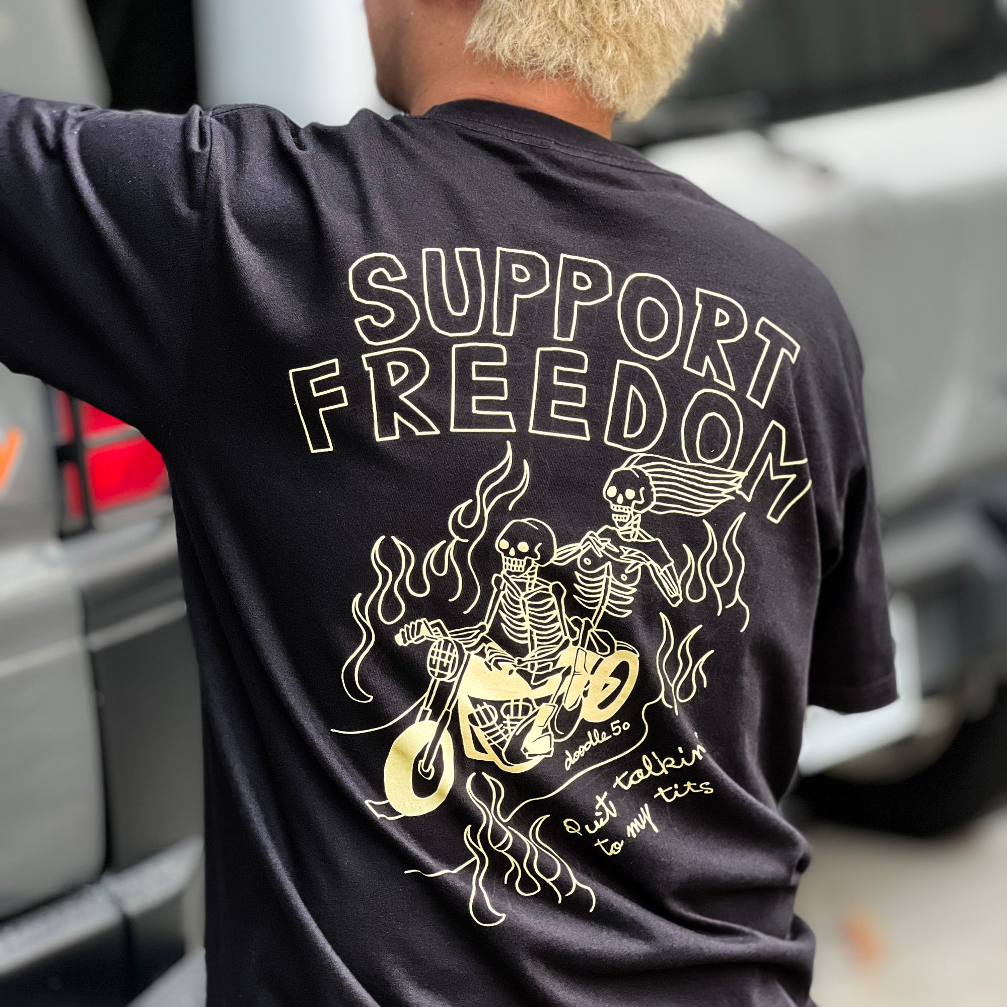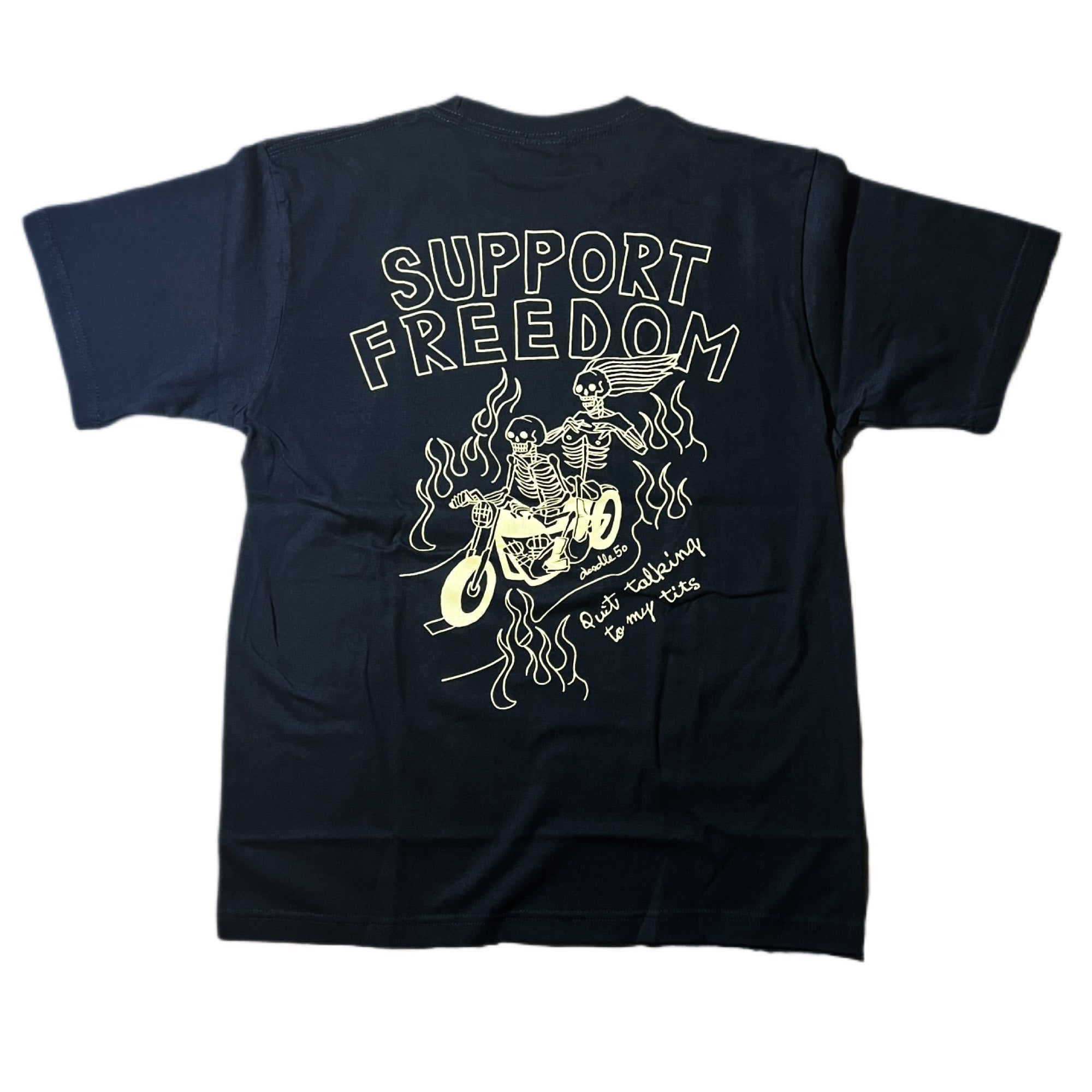 主標語 SUPPORT FREEDOM 在 60-80 年代不只是一句口號,更是美式機車文化中的信仰與態度,也象徵著騎士不受社會規範約束的自由!而裸女加上次標題 Quit talking to my tits,字面意思是女性制止異性目光只盯著她的胸部說話,直接又幽默的提醒對方尊重女性。