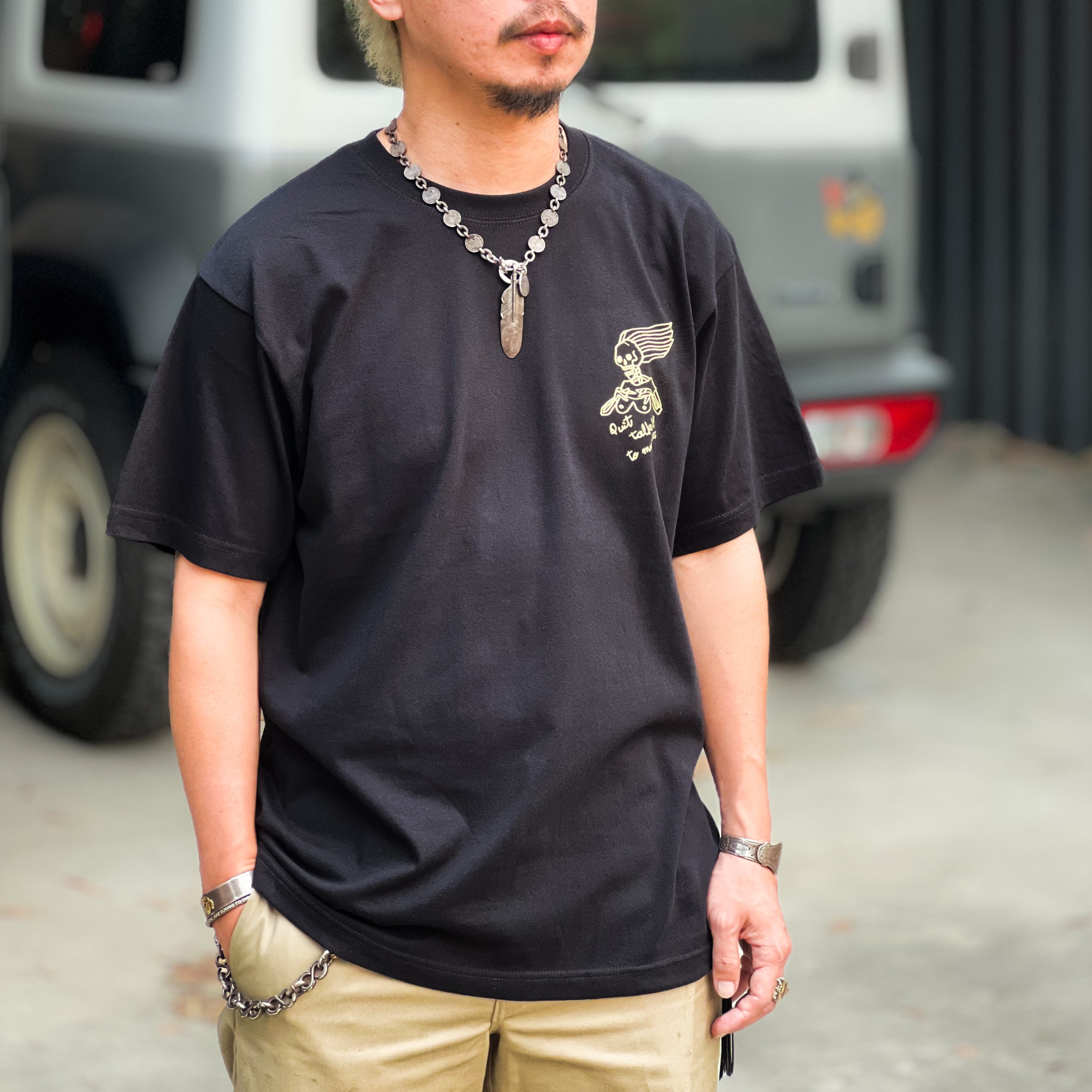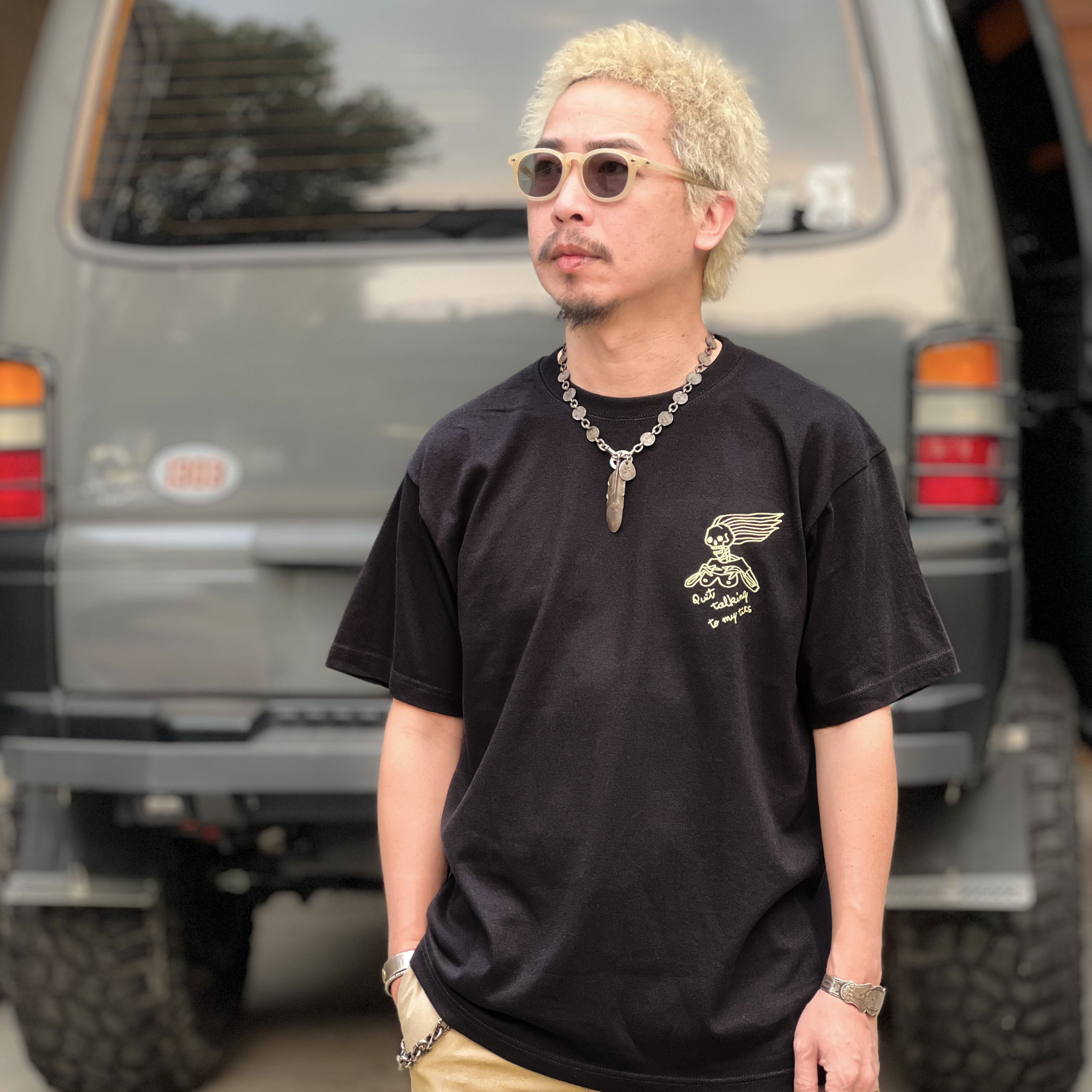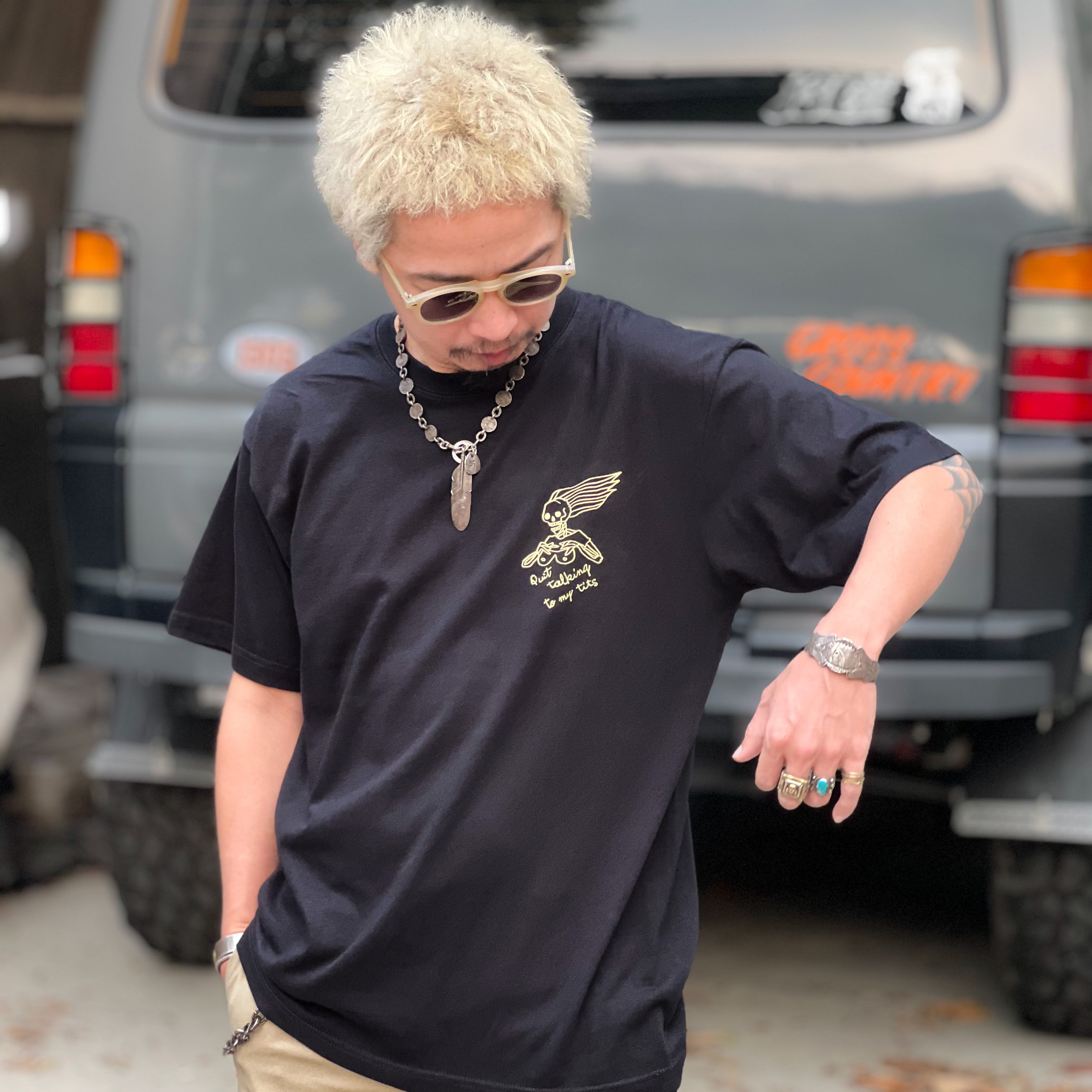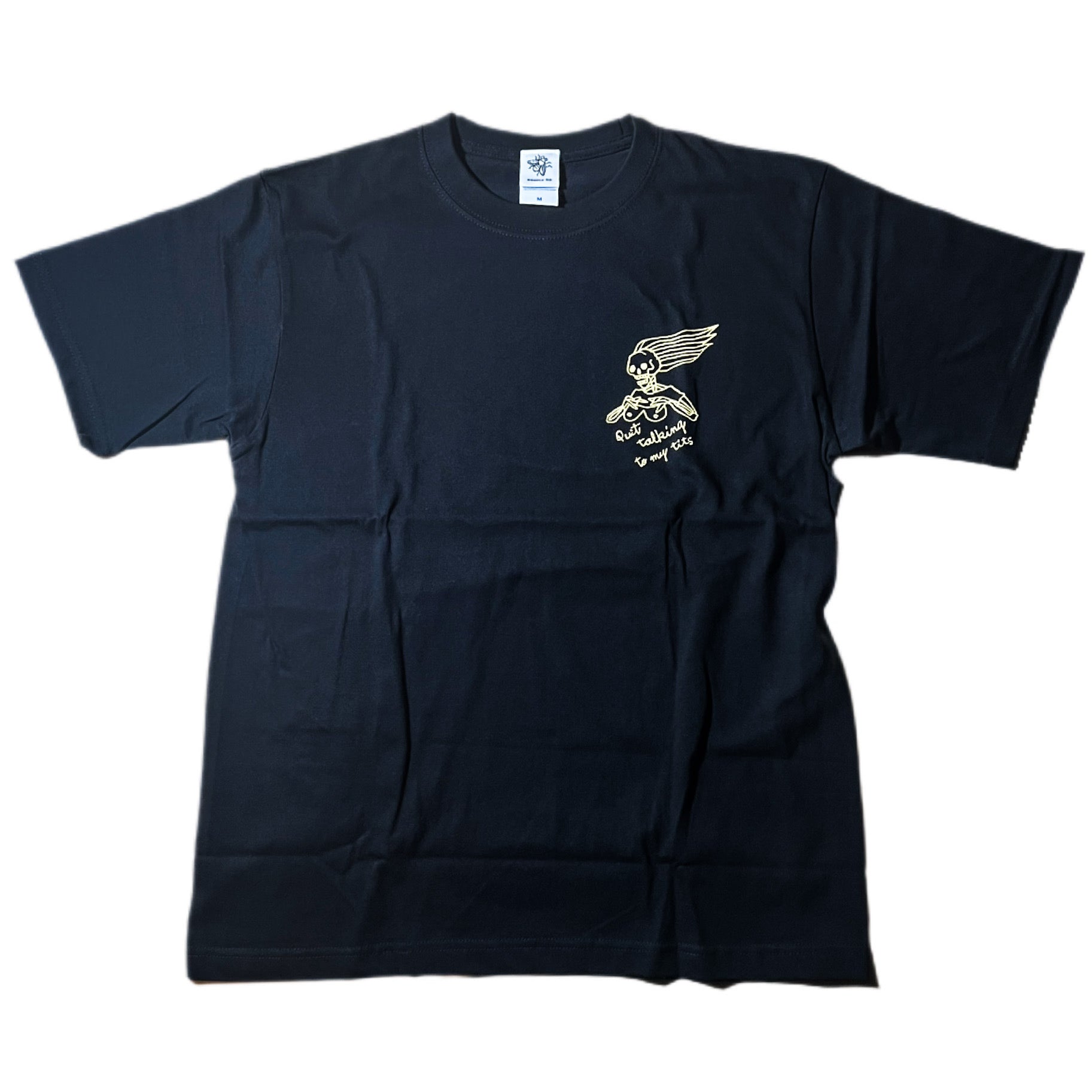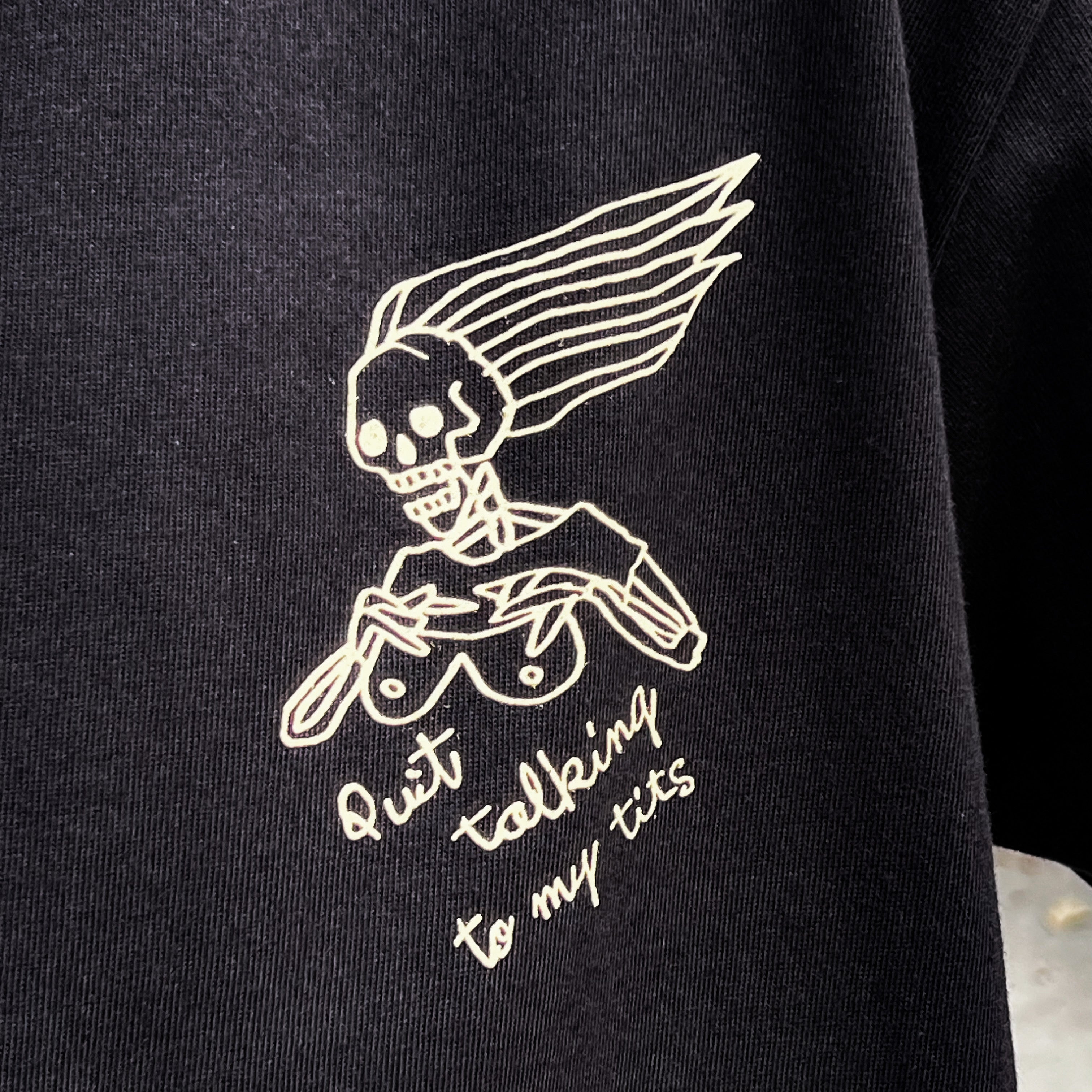 主標語 SUPPORT FREEDOM 在 60-80 年代不只是一句口號,更是美式機車文化中的信仰與態度,也象徵著騎士不受社會規範約束的自由!而裸女加上次標題 Quit talking to my tits,字面意思是女性制止異性目光只盯著她的胸部說話,直接又幽默的提醒對方尊重女性。