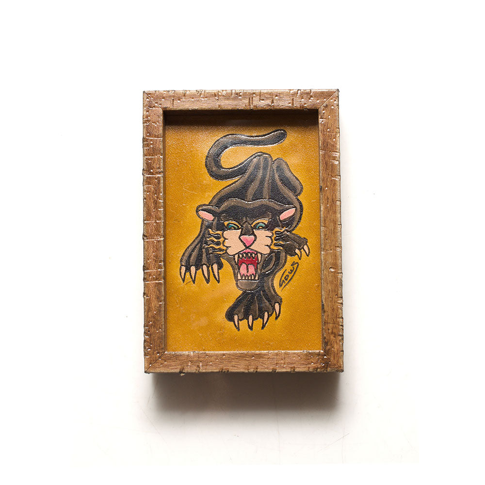 由皮革藝術家 Wee 氏透過皮雕與刺青技巧在整片皮革上創作美式傳統刺青圖像,迷你的平面刺青作品,也是很多人會入手作為居家風格擺件。