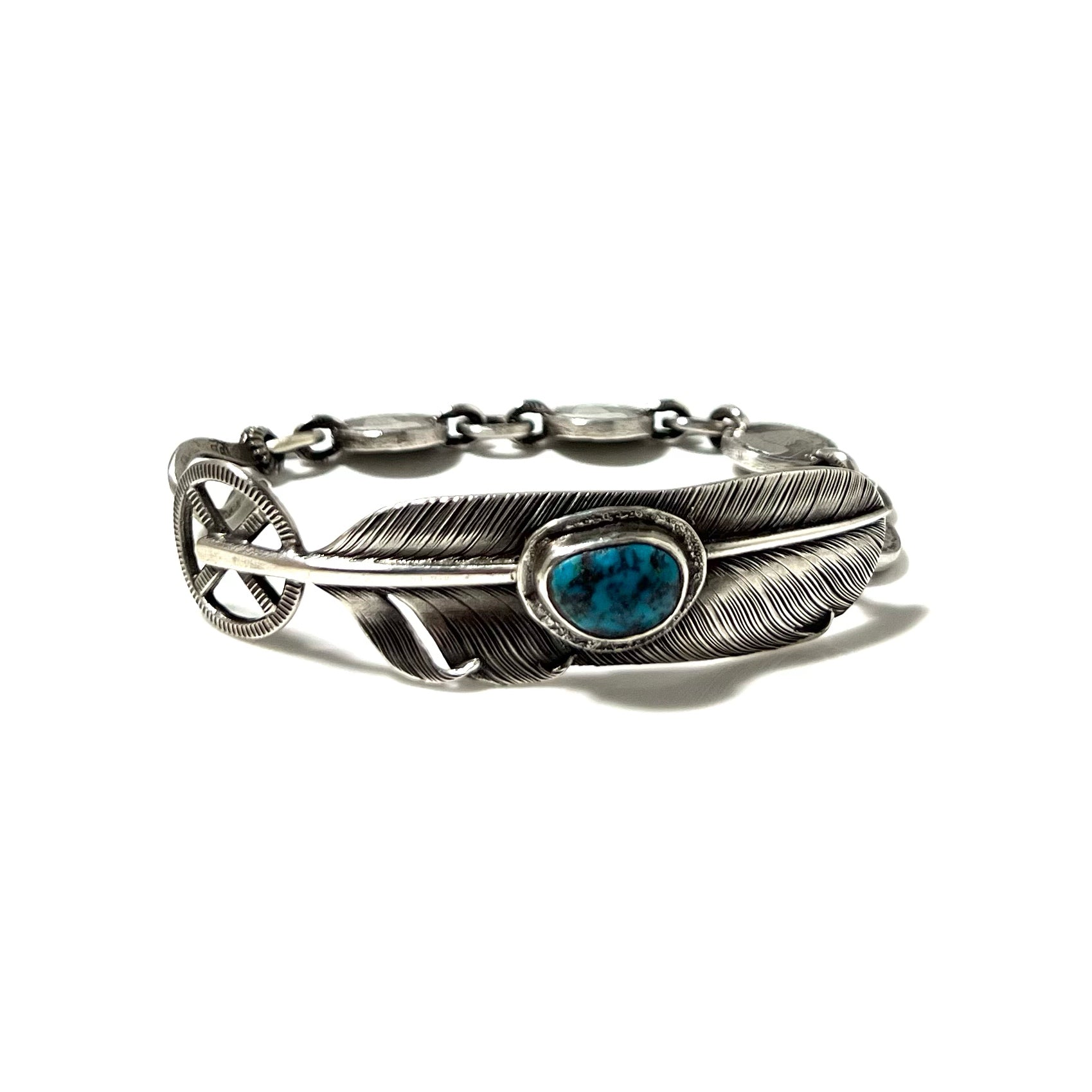 大羽是選用和平鷹銀幣,將銀幣對半剖開保留兩面不同的圖樣,圖像製作在羽毛背面,刻意將女神頭像刻成骷髏,另外加上客製的文字 LOVE。正面維持羽毛的手敲紋理,並加上奢華的 Bisbee 土石包嵌。
